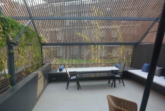 The most sunlit area of the house is the expansive terrace, an ideal retreat for relaxation. It features a marble-finish table paired with outdoor seating, and a stunning marble wall with a cascading fountain adds regal grandeur. The design evokes the calm ambience of a palatial courtyard.