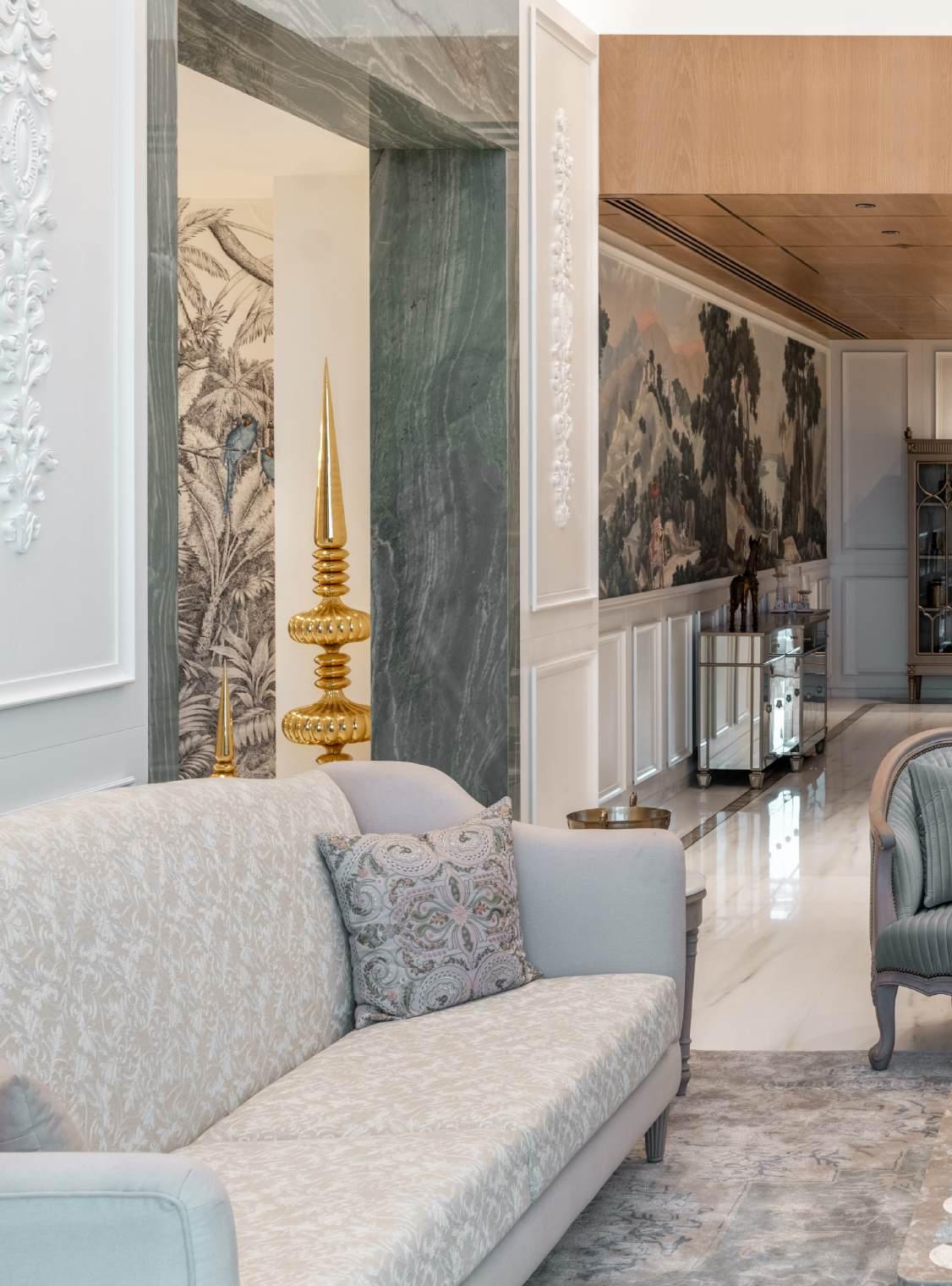 The living room, a visual delight, is characterised by a double-height ceiling that amplifies its grandeur. The space is a celebration of marble, with golden-upholstered sofas arranged on a vintage carpet. An ornate metal chandelier bathes the room in an ethereal glow, highlighting intricate Indian motifs on the furniture.