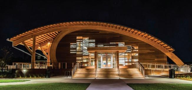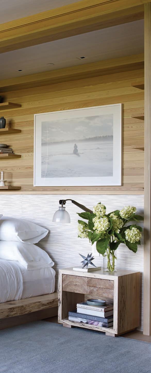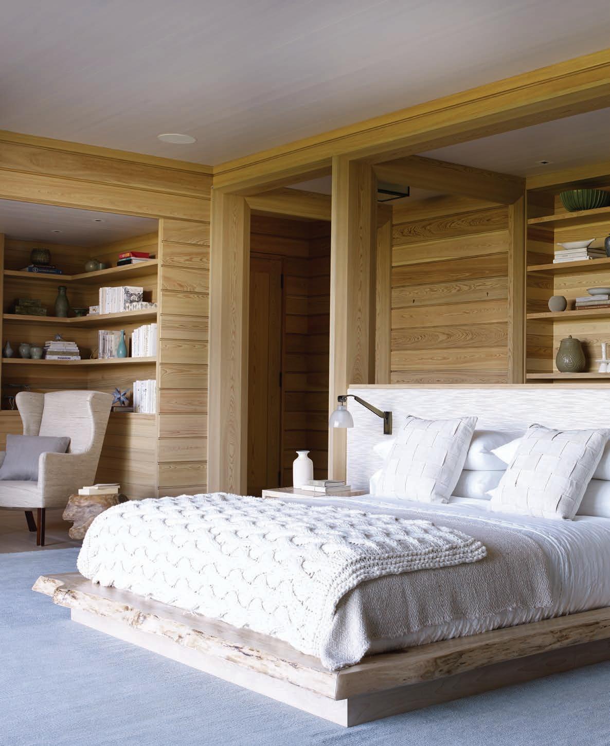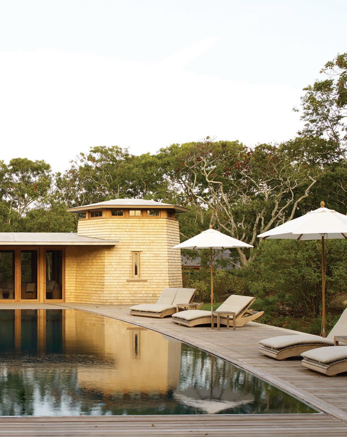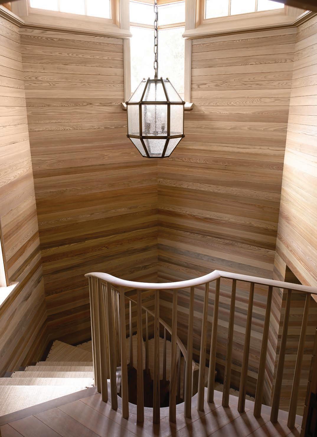 Perhaps nowhere is this more apparent than in the staircase connecting the two levels. A sweeping arc carved from 27-footlong boards of sinker cypress, it mirrors both the physical movement between floors and the visual horizon of ocean meeting sky. At night, seen from the courtyard, the stair’s convex form plays poetically against the concave curve of the clerestory windows above.