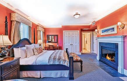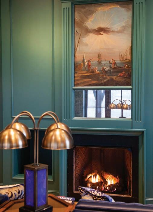 Custom, Victorian-tiered chandeliers of shimmering blue-green prisms in the lobby, as well as the sconces in the hotel’s La Plage Restaurant & Oyster Bar, echo a time when prisms refracted daylight on ships to illuminate life below deck. A trumeau mirror, crowned with a maritime painting, hangs above the fireplace in the lobby – the setting for the Juniper Books installation, whose spines form a whaling ship and a map of Mystic Seaport.