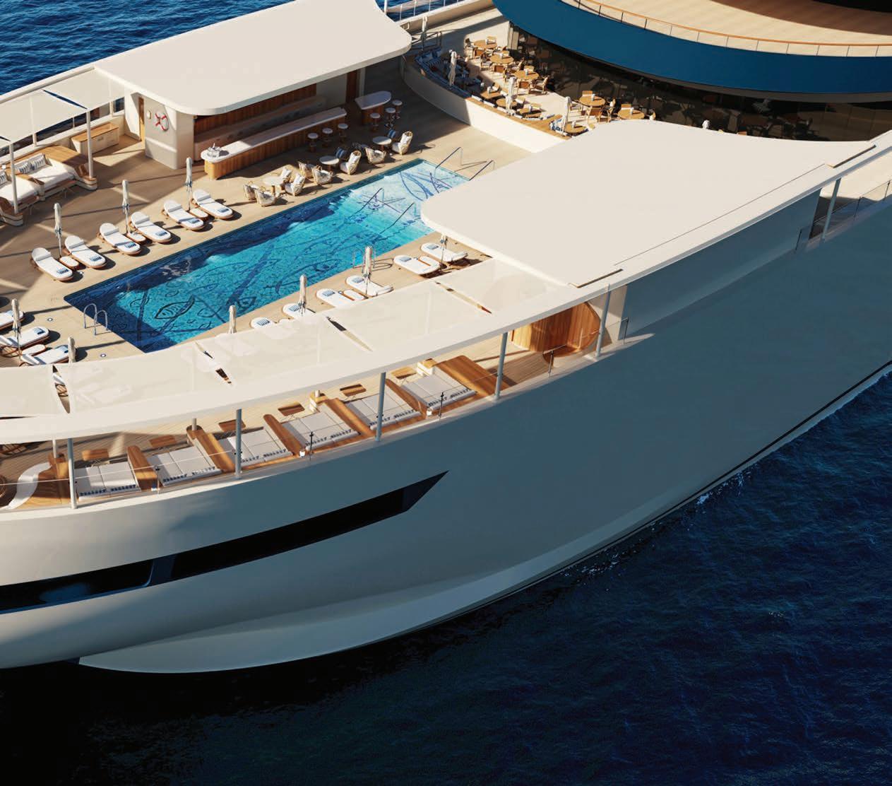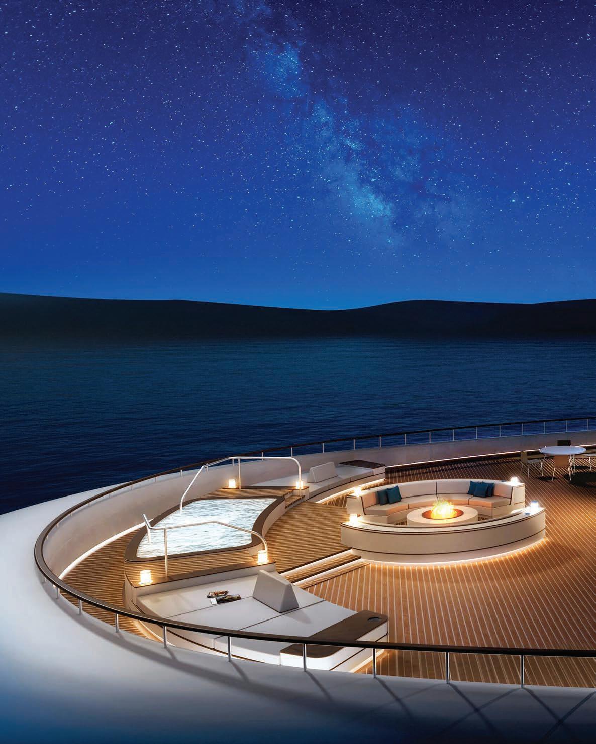 living space. With floor-to-ceiling wraparound curved glass windows costing USD 4.5 million, this engineering masterpiece provides stunning 280-degree panoramic views – a true spectacle at sea.