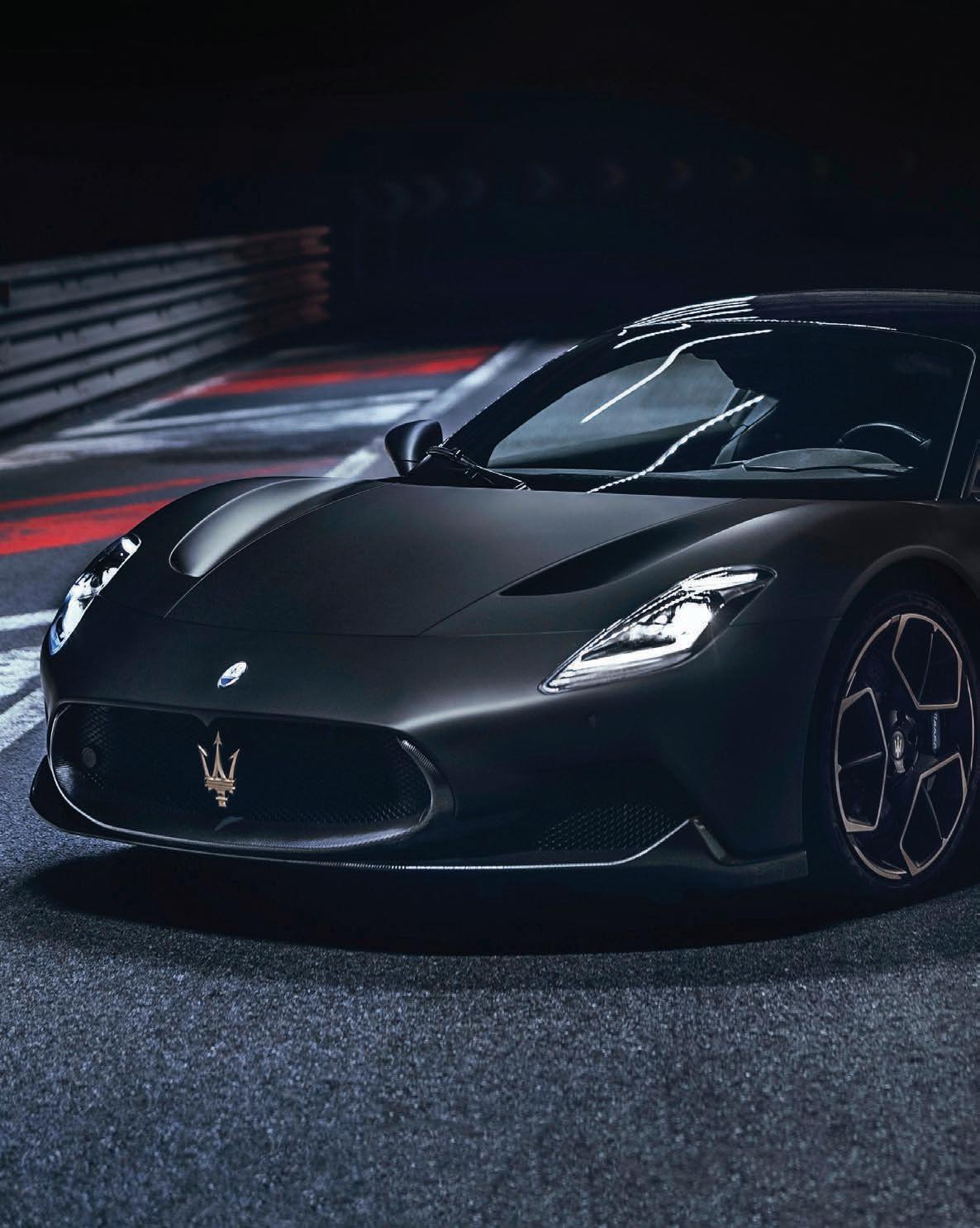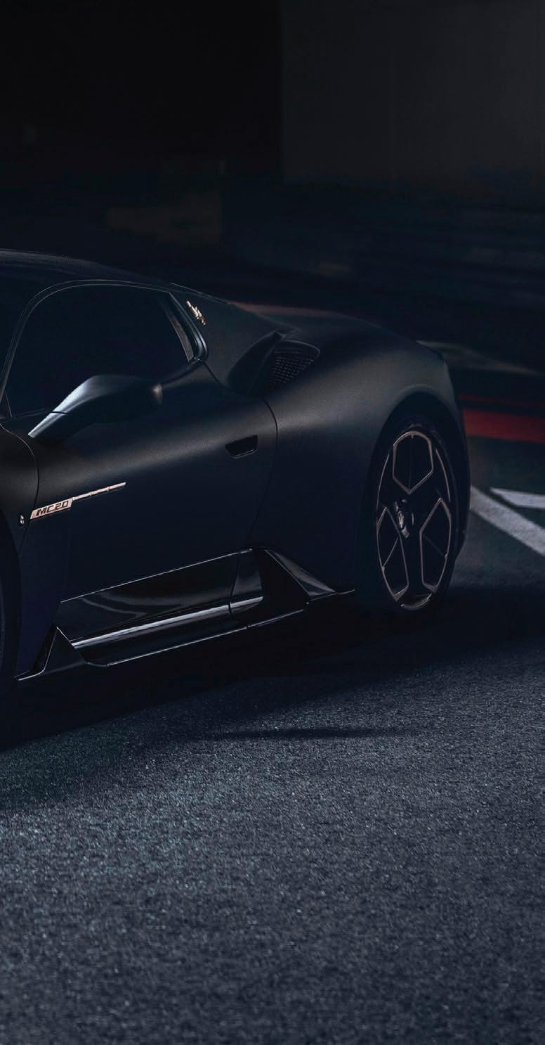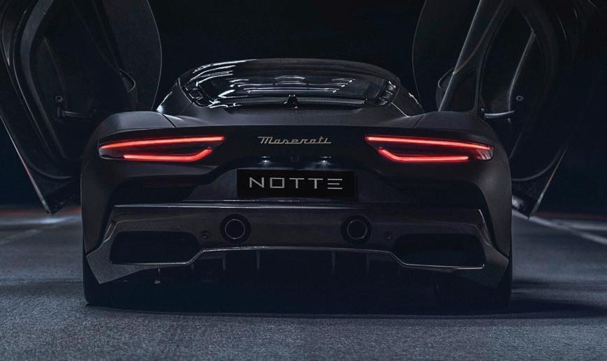 Klaus Busse, Head of Maserati design, explains, “Fuoriserie means ‘custom-built’ in Italian, and our Trident’s customization program aims to create one-ofa-kind rolling sculptures. MC20 Notte celebrates the thrill of racing and the allure of the night, combining supreme performance and Italian elegance with a touch of nocturnal mystery. It’s the first Fuoriserie limited edition of MC20 and is dedicated to super sportscar collectors and track enthusiasts.”