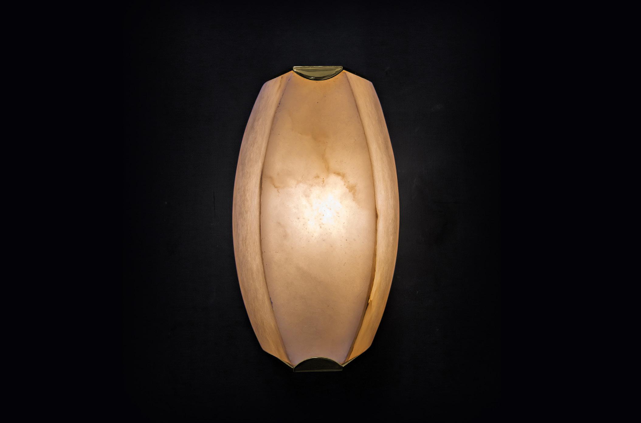 A curvaceous shade of hand carved natural alabaster caught with a clasped frame of natural bronze, polished brass or polished nickel