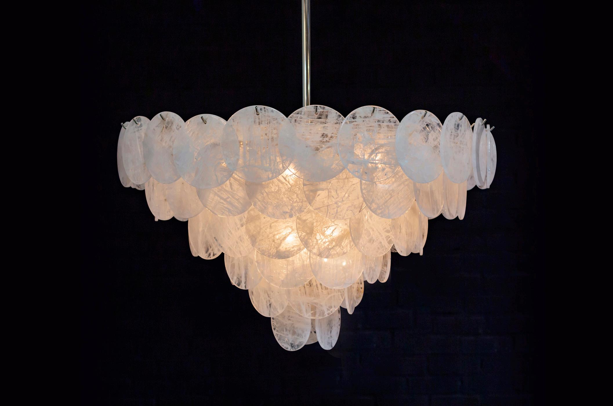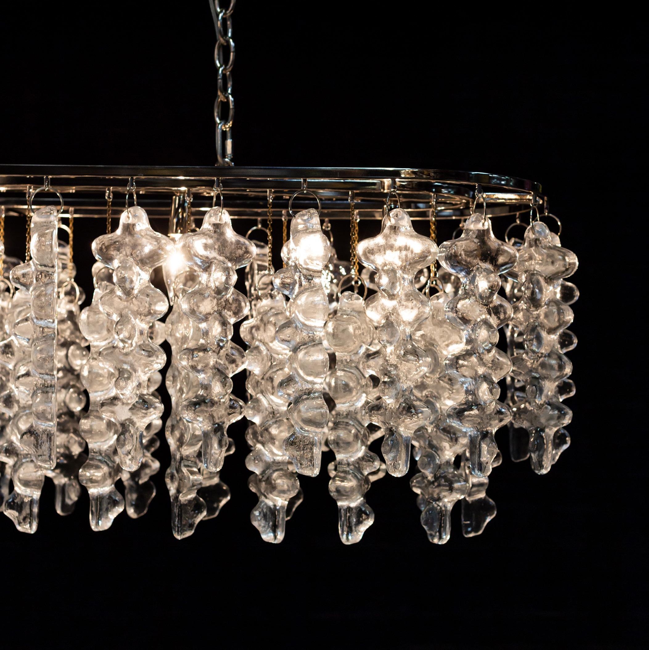 Tiers of organic Venetian glass forms, modeled after a brutalist sculpture, hang heavy yet light as air - like icicles melted in winter sun then frozen once more