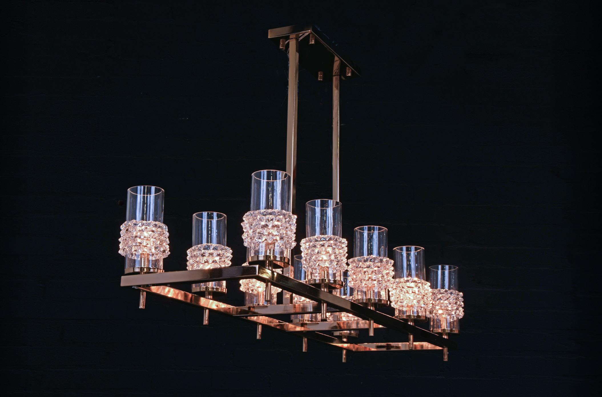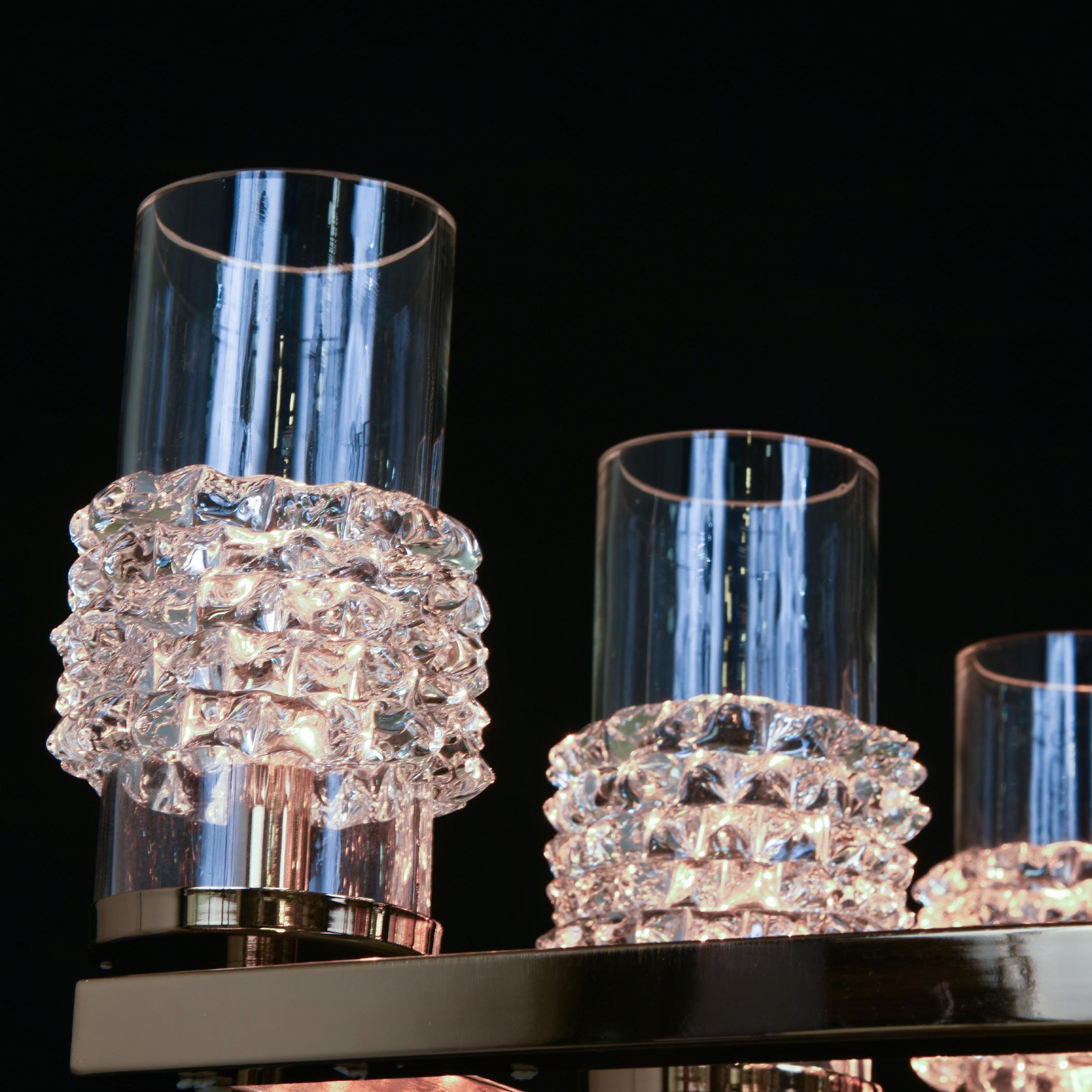 Rows of Murano cylinder shades with rostrato spiked glass bands pose stylishly atop a gleaming banded frame of beautiful bronze or nostalgic nickel