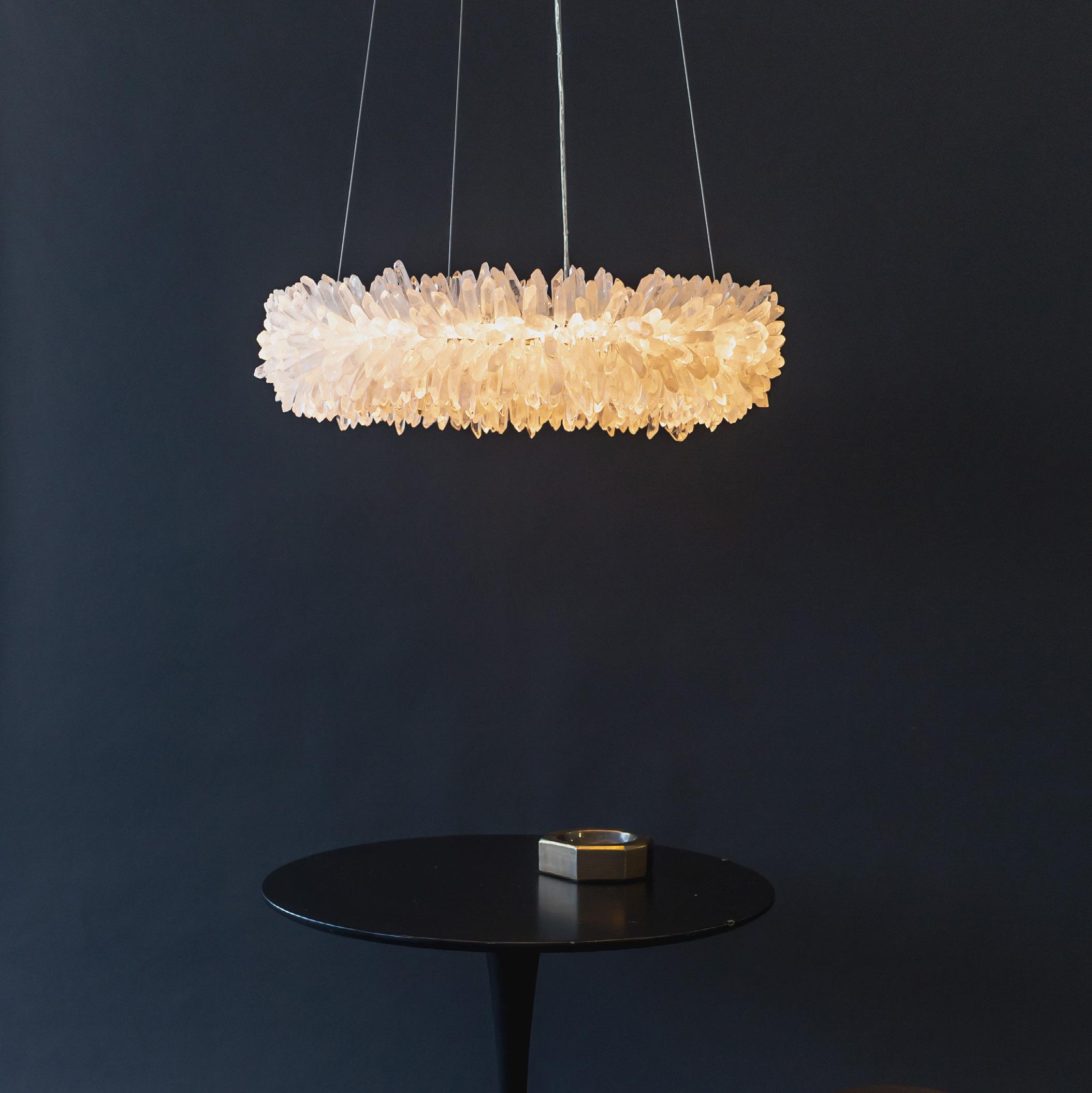 Like a celestial body, overlapping discs of natural blanco white or fume smoke quartz rock crystal suspended with either mirrored nickel or bright brass metal finish