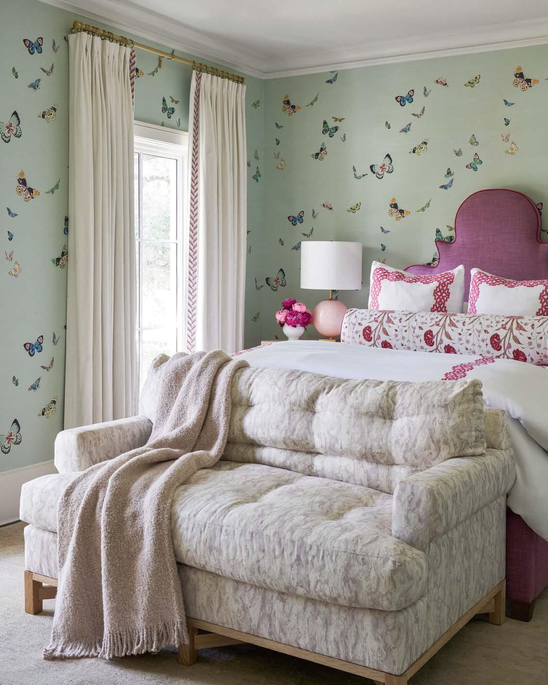 Opposite: Caitlin McGauley’s Butterflies grass-cloth wallpaper from James Showroom graces the daughter’s bedroom walls. The headboard wears Castel Panarea fabric, the lumbar pillow dons Schumacher’s Khilana Floral pattern and bedding is from Walker Valentine. A custom sofa sports Zak+Fox’s Kaze linen.