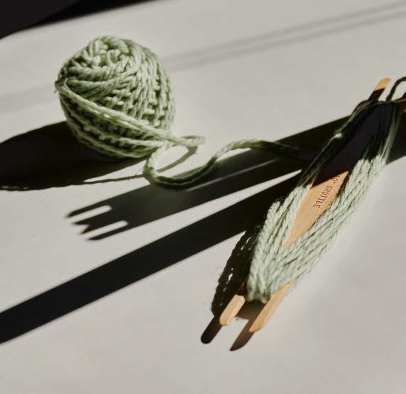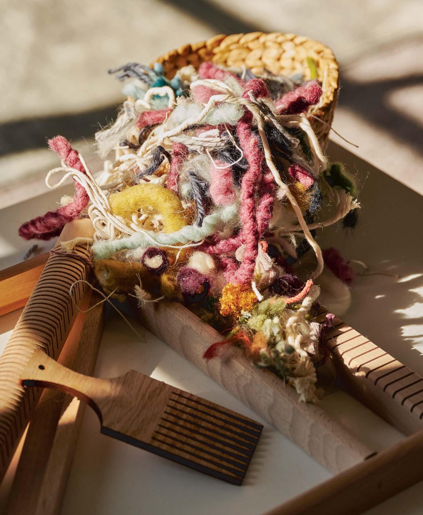 Dallas textile artist Shaylee Southerland (opposite) often reveals vertical warp threads (left), using the negative space to create balance and scale while giving viewers an idea of how the piece was made. Her tools include a stick shuttle (below), which keeps longer lengths of weft yarn or threads tidy while weaving, and antique wooden spools (bottom, left). Commissioned vintage woven rackets (bottom, right) feature wool and cotton fibers.