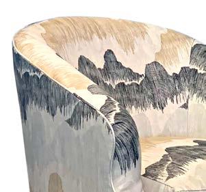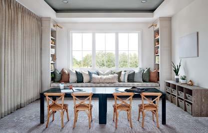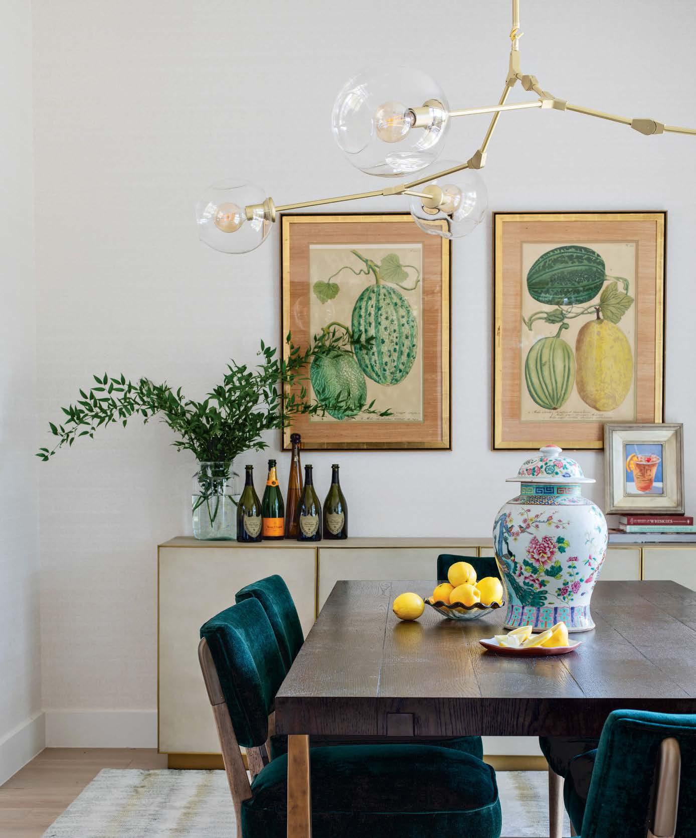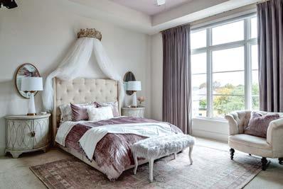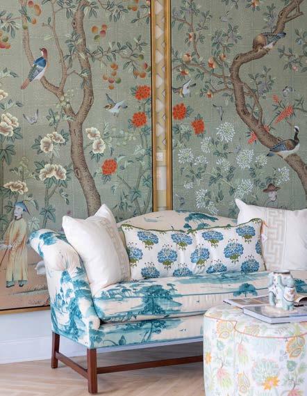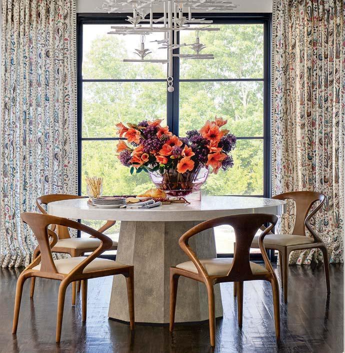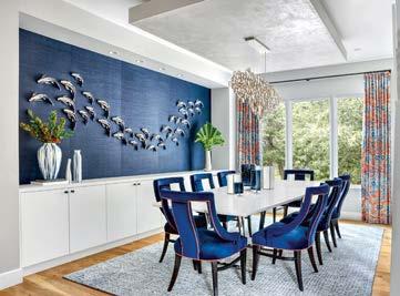 Where the interior designer enveloped entire rooms in color, the family’s favorite hues helped cultivate a sense of belonging. This is especially true for the clients’ grown children, as “it was important they feel comfortable here,” notes Karen. With that in mind, Wagner swathed the daughter’s bedroom with whimsical butterfly wallpaper in her favorite shade of green, while their son helped select his bathroom’s blue-andsilver wallcovering. At the same time, Wagner fully indulged Karen’s passion for pink, “which her husband was also quite comfortable with,” assures the designer. But the rosy tones never feel one-note, instead diffusing through various patterns and textures. Examples include the watercolor-like wallpaper, gauzy draperies and porcelain chandelier in Karen’s light-filled home office. Elsewhere, in the dining room, botanical prints on the rug and wallpaper alongside chairs upholstered in a pale-pink leather (with just a hint of sheen) create an idyllic atmosphere.