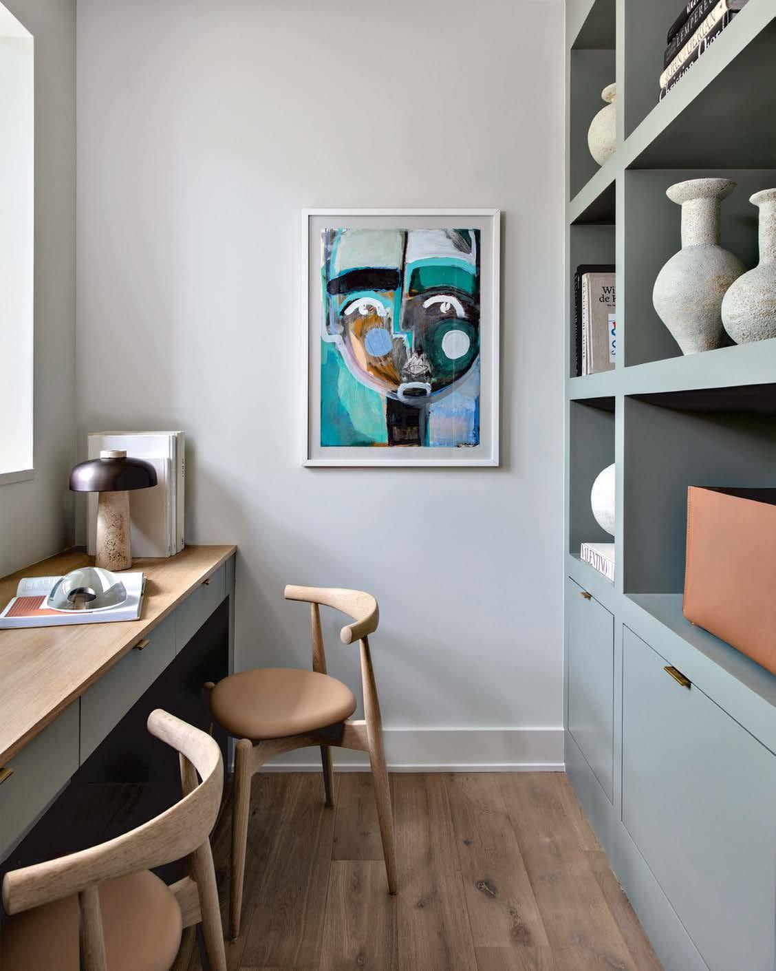 Opposite: The study pairs a built-in oak desk with CH20 Elbow chairs from Design Within Reach. A Sally King Benedict abstract complements cabinets painted Farrow & Ball’s Pigeon. Pottery is by D-Haene Studio.