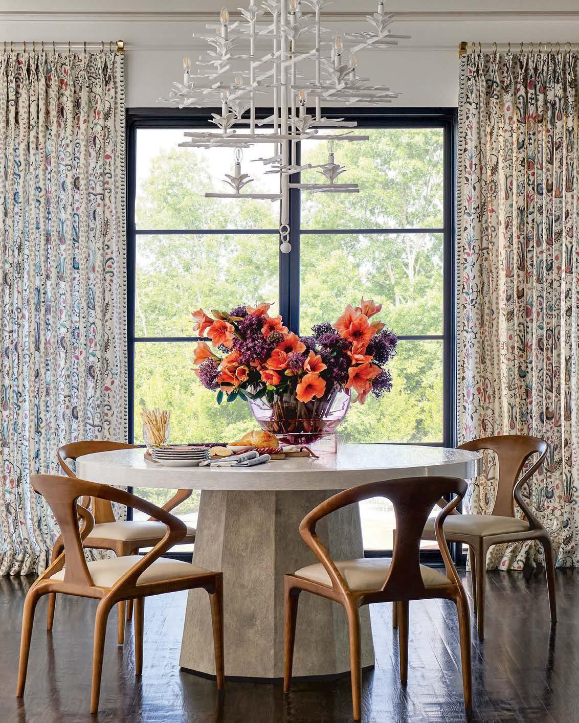 Opposite: A Paul Ferrante chandelier illuminates Iatesta Studio’s breakfast area table and chairs from AF Home in Edelman leather. Draperies don a Penny Morrison fabric from James Showroom. Florals are by Laura Grant.