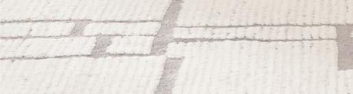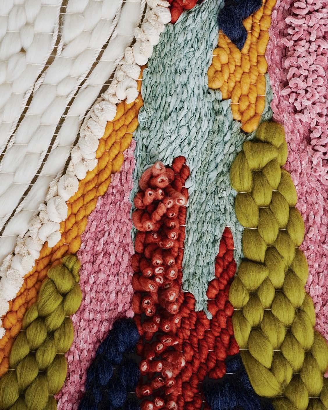 one-of-a-kind works. Her now-signature approach prioritizes texture and dimension over planning—although her technique requires a significant amount of precision. Instead of closely following a preordained design, she typically takes inspiration from the fibers themselves—wool roving, cotton cord and rope, core-spun alpaca yarn, chiffon, sari silk and linen, all in varying weights, thicknesses and colors. She stretches, knots, plaits or twists them to create lavish textures. Then, working with a double-warped loom—which provides the necessary structure for her flowing forms— she extemporaneously weaves the fibers over and under the vertical warp threads. Tamping some down tightly, she allows others to stand out in billowy bits or plush tangles and tufts. “I want that texture to provide enough visual interest so that a viewer can walk up to a piece at least 20 times and always see something new,” the artist explains.