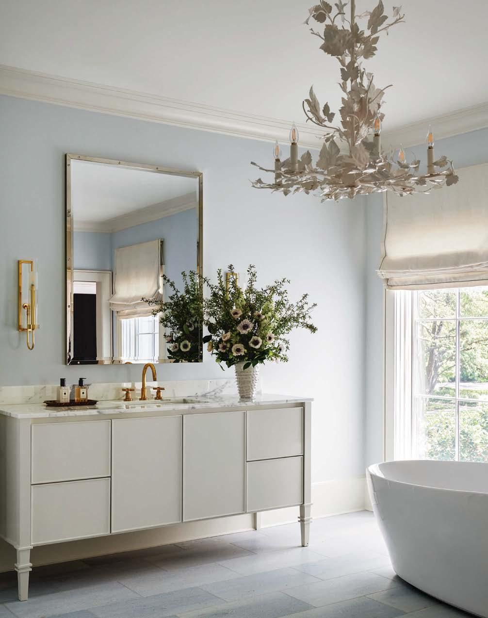 Above: Walls painted Sherwin-Williams’ Alabaster, a Toto zero-gravity tub and Artistic Tile flooring conjure a spa-like primary bathroom. Lighting includes The Urban Electric Co.’s Marlborough sconces and Vaughan’s Windermere chandelier. The RH mirror hangs behind a Crosswater London faucet from Pierce Hardware.