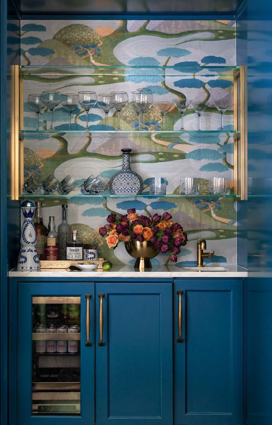 Right: The hidden family room bar reveals cabinets in Benjamin Moore’s Bainbridge Blue and Aux Abris’ Fortune River wallpaper. A counter from Stone Boutique rests beneath shelving by Betzinger Designs. The faucet and pulls are from Pierce Hardware.