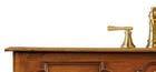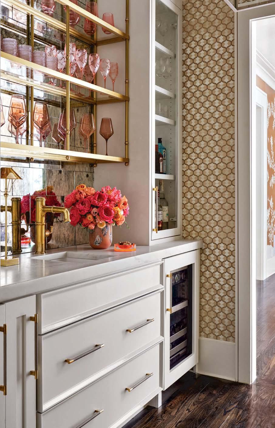 Left: Holland & Sherry’s Abiya Shanasheel wallpaper accents a bar area. An antique mirror backsplash, Waterworks faucet, pulls from Pierce Hardware and brass shelving by Betzinger Designs complete the space.
