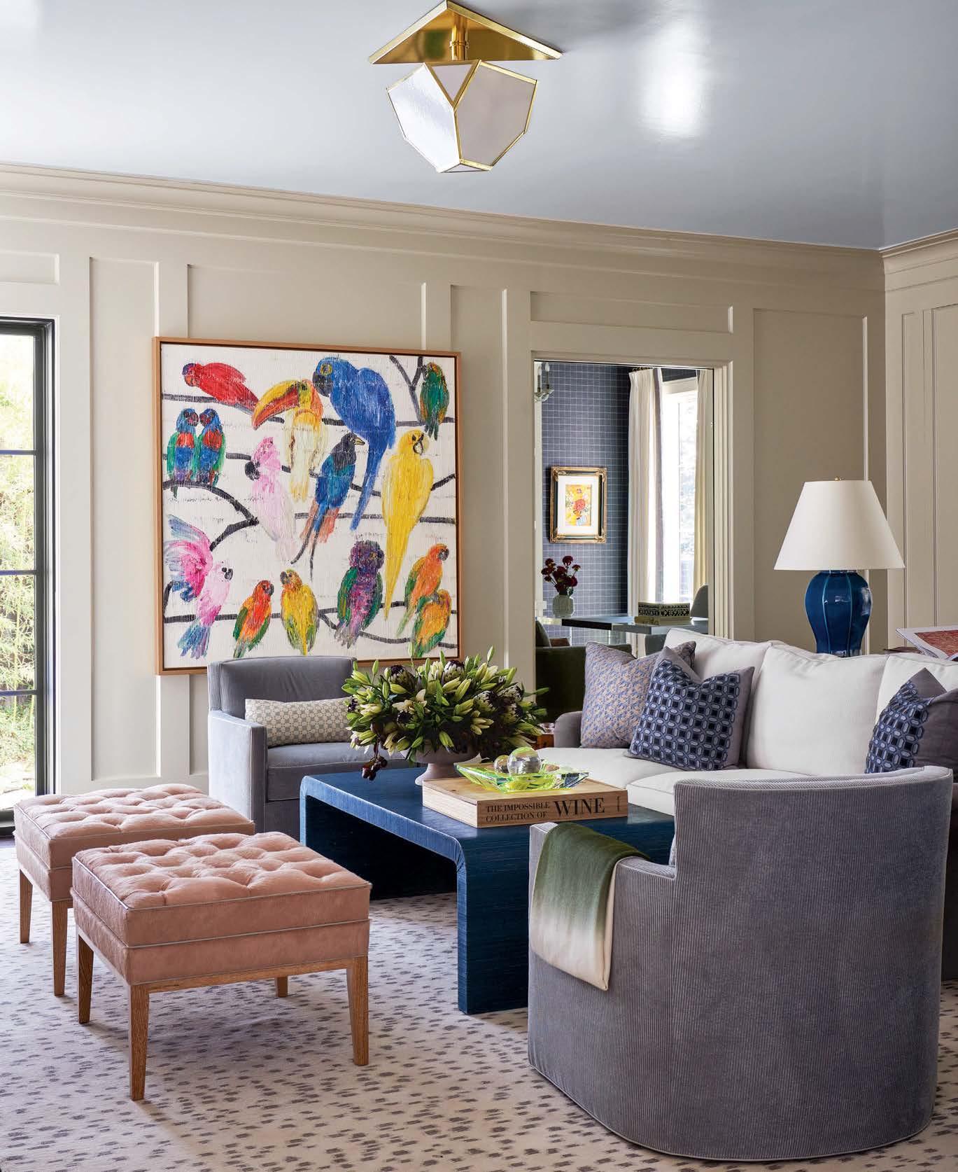 Opposite: Hunt Slonem’s parrot painting inspired the family room’s benches in Kyle Bunting hair-onhide, grass-cloth coffee table and Christopher Spitzmiller, Inc. lamp. The Urban Electric Co. pendant lights an Elson & Company rug.