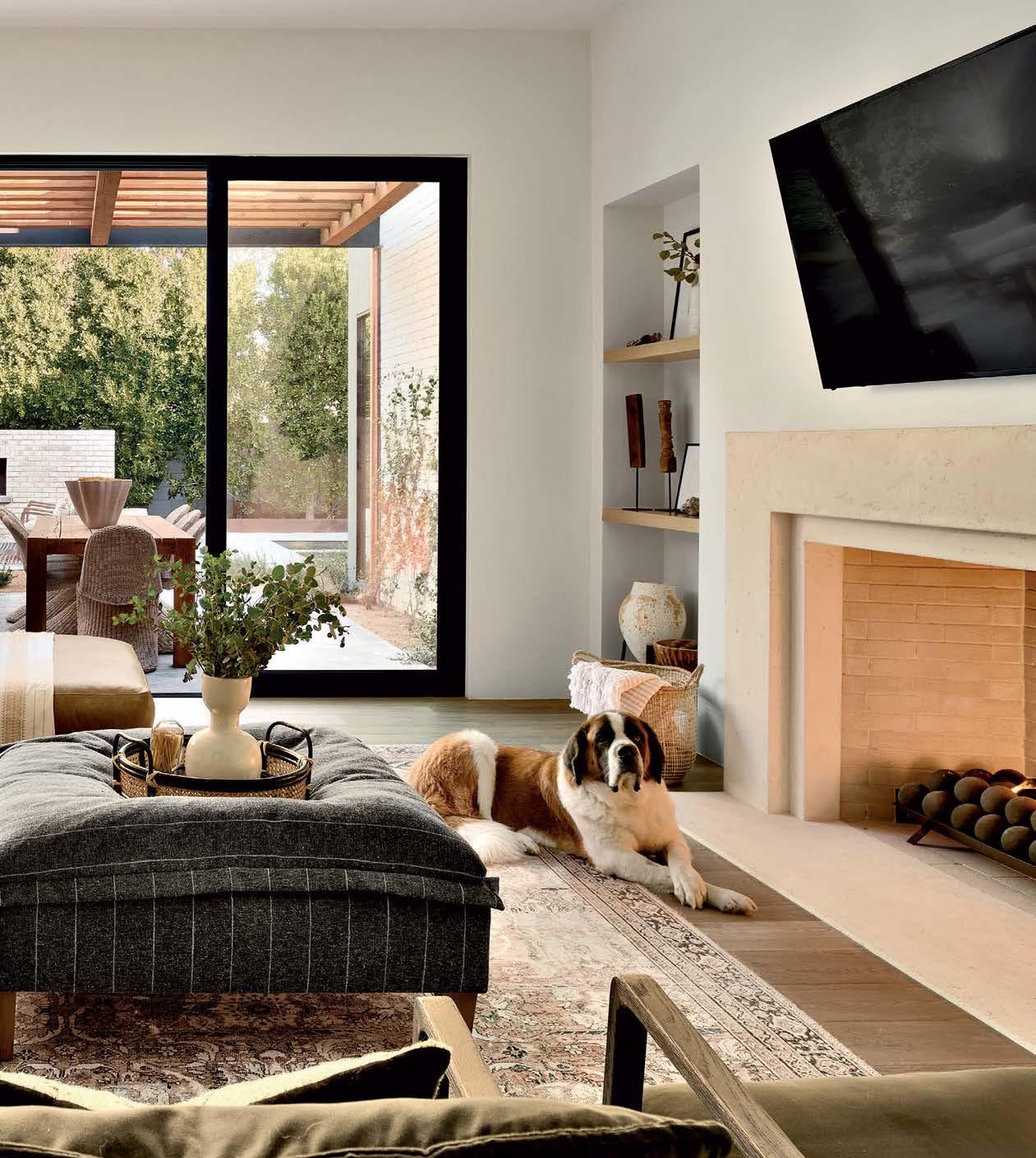 Above: Sliding doors connect the primary bedroom to the backyard, creating a peaceful vibe. A Four Hands side table and chairs gather in front of the fireplace, which is finished in a plaster from Texston Architectural Surfaces.