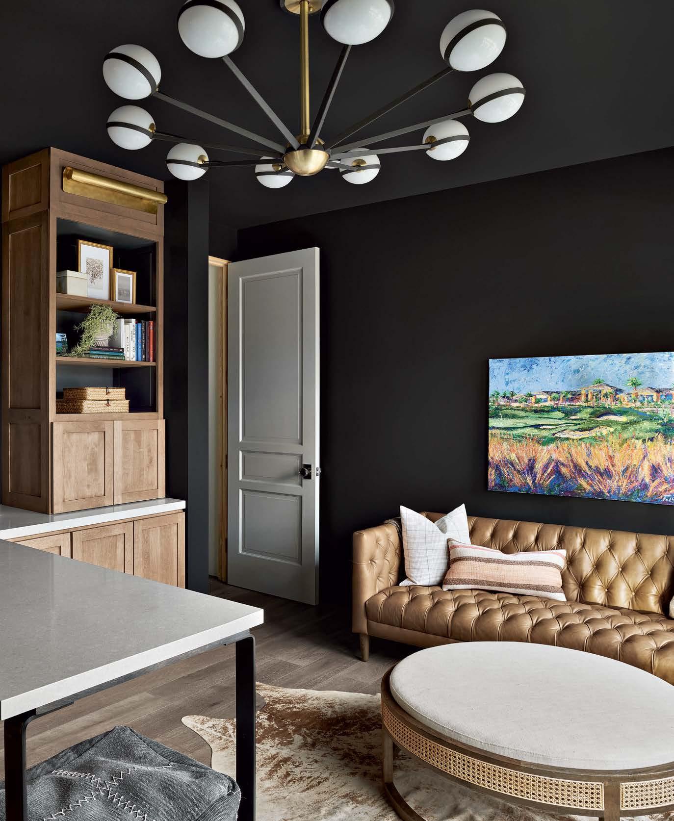 Opposite: In Chris’ office, walls painted Sherwin-Williams’ Iron Ore put the focus on meaningful pieces, like artwork by a childhood friend. The Four Hands sofa and coffee table are joined by a Hudson Valley Lighting chandelier.