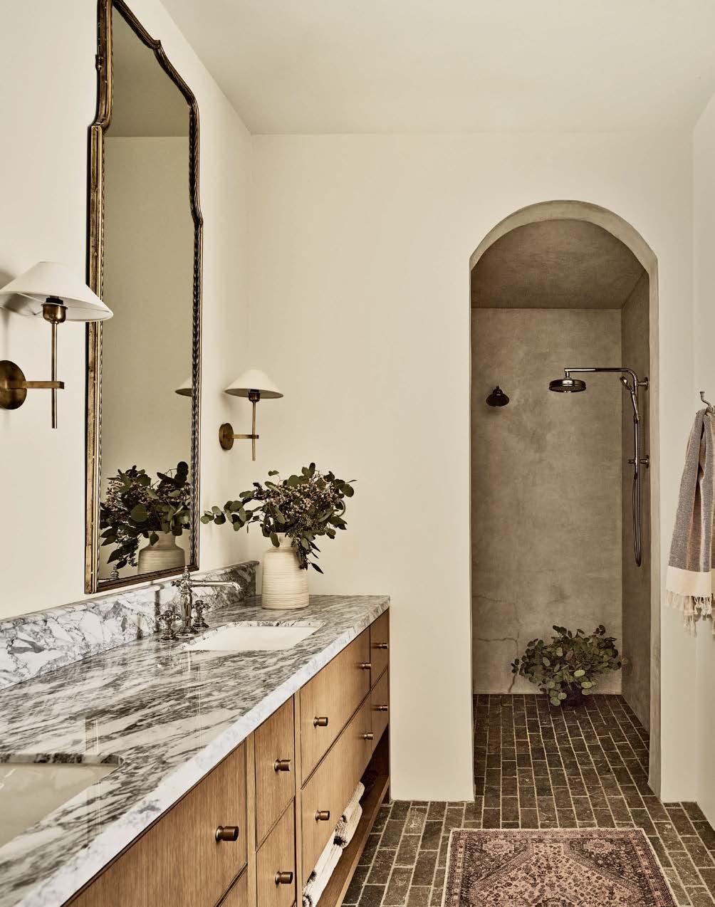 Opposite: Like their bedroom, the couple’s bathroom was designed to be a calming space. Dark marble floor tiles and heavily veined marble countertops are dramatic counterpoints to the Highborn Cabinetry-crafted vanity. The sconces are by Visual Comfort & Co., and the plumbing fixtures are Kohler.