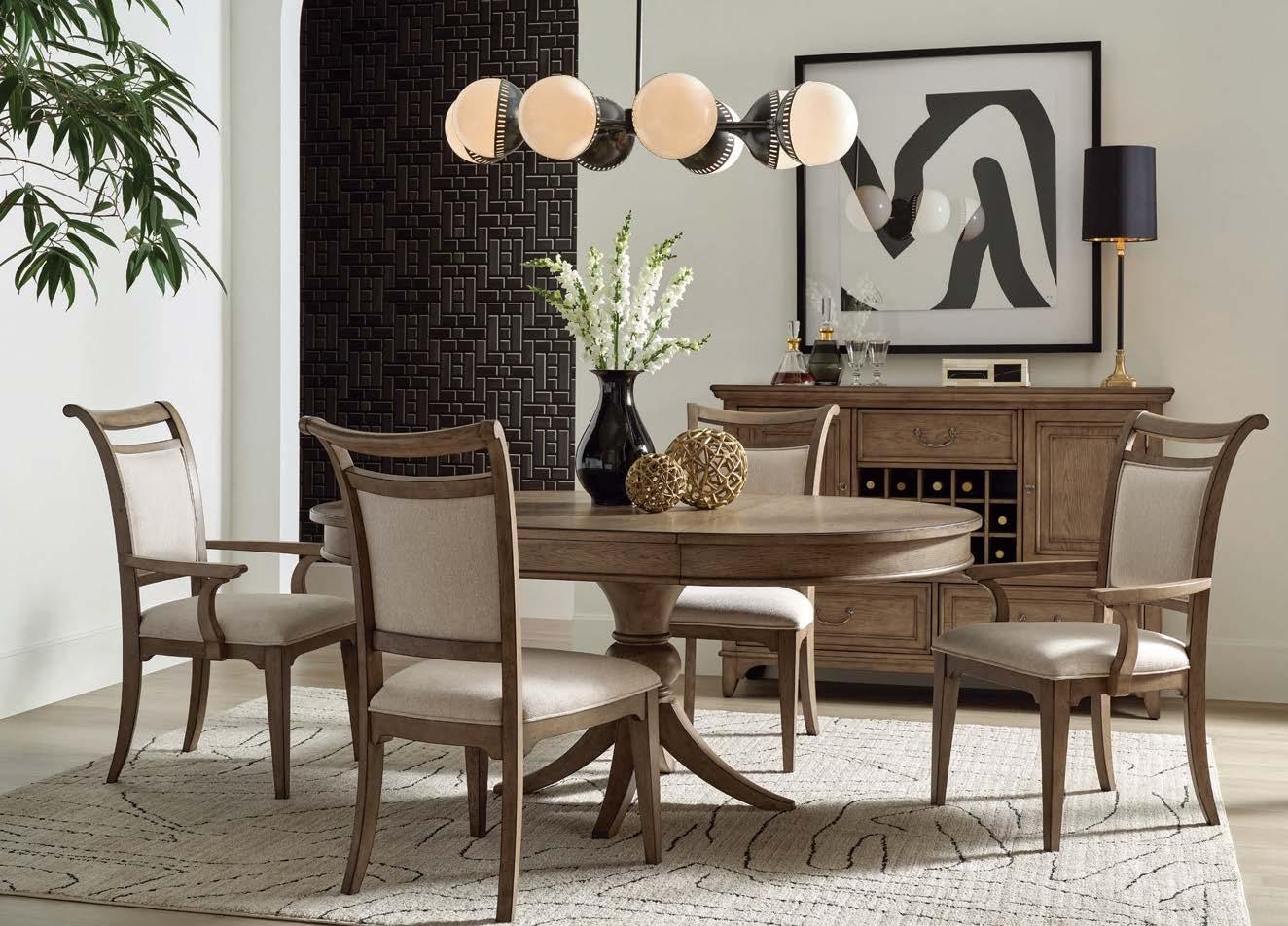 Opposite: Molly turned to Four Hands for much of the dining room furnishings, including the table, chairs, inset metal cabinets and fan artwork. The scene is illuminated by an Arteriors chandelier.