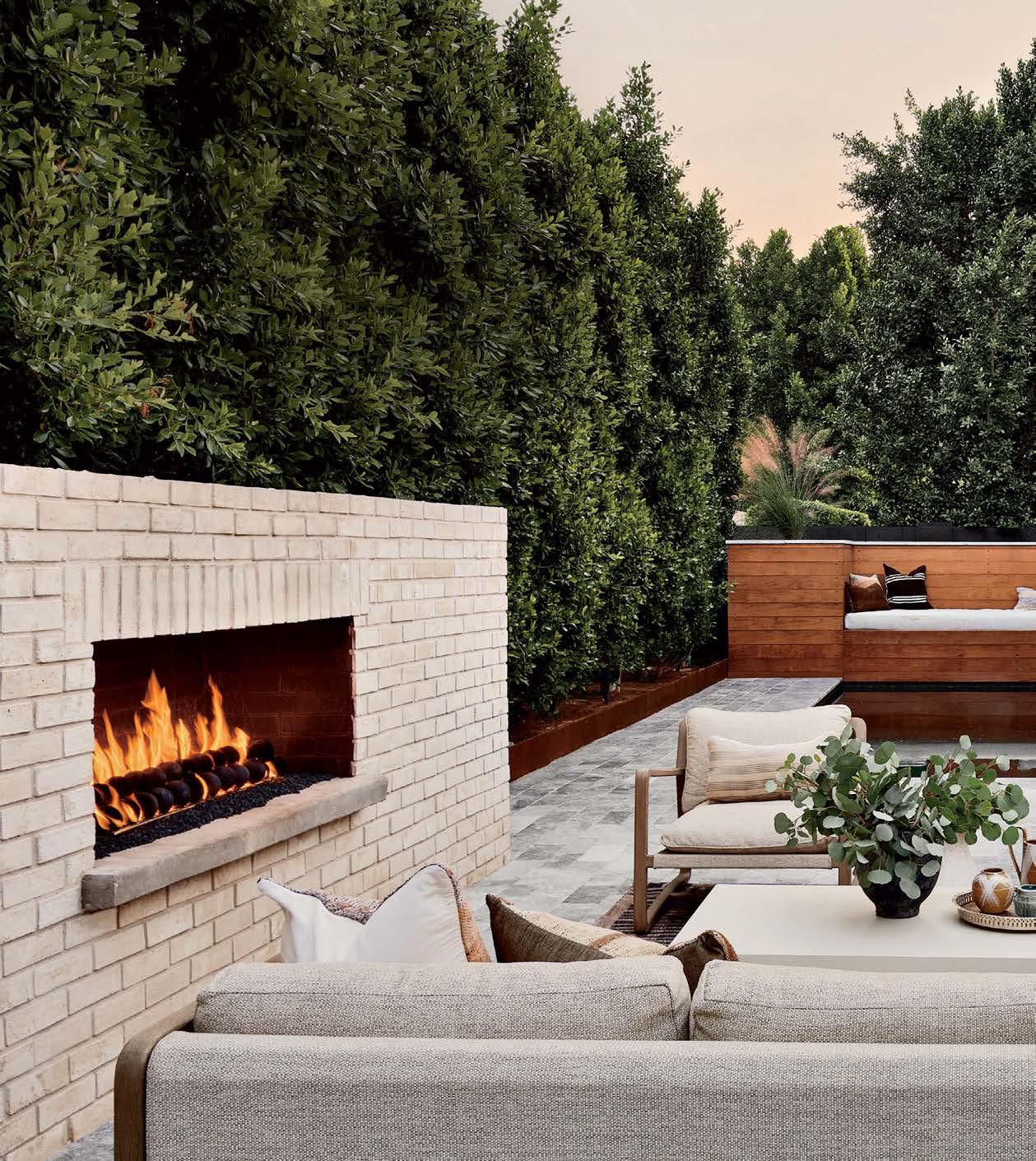 To reinforce the wellness aspect they craved, the couple designed their bedroom to overlook the backyard, which features multiple lounging areas, a fireplace, small pool and meditation bench with a waterfall, all surrounded by mature trees. “We wanted the bedroom to be connected to the outside, and it feels like a retreat—waking up to that is wonderful,” Molly says. Minimal furnishings and simple linen draperies add to the airy feel.