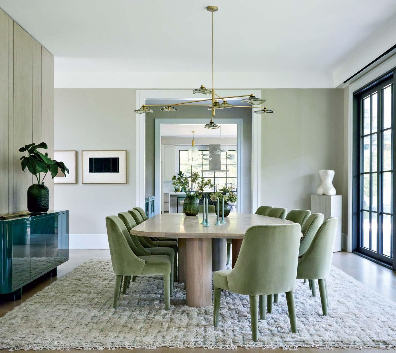 soft, luxurious fabrics. In the open living room, a blue silk-velvet sofa, whose tufting is a nod to tradition, is joined by statement pieces like a bronze-and-charred-oak coffee table and a pair of brushed-metal foot stools covered in sheepskin. Taking their color cues from the grounds designed by Jeremy McVicars, the duo also looked to the environment when it came to furniture shape. “In nature, there are no right angles. We wanted sensual, rounder forms that blend with the landscape beyond,” Kalman says, calling out two different pairs of curvaceous chairs that further soften the room.