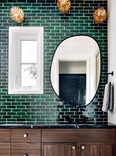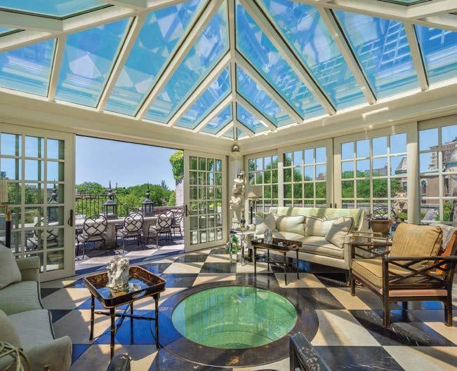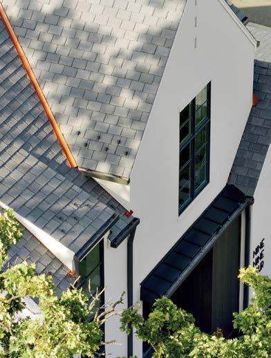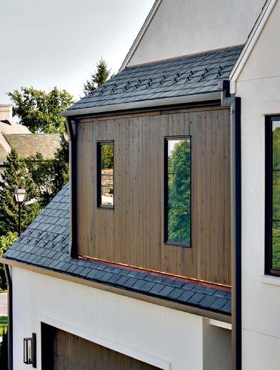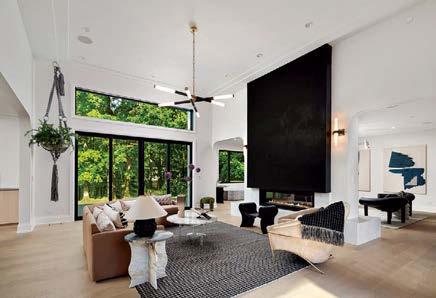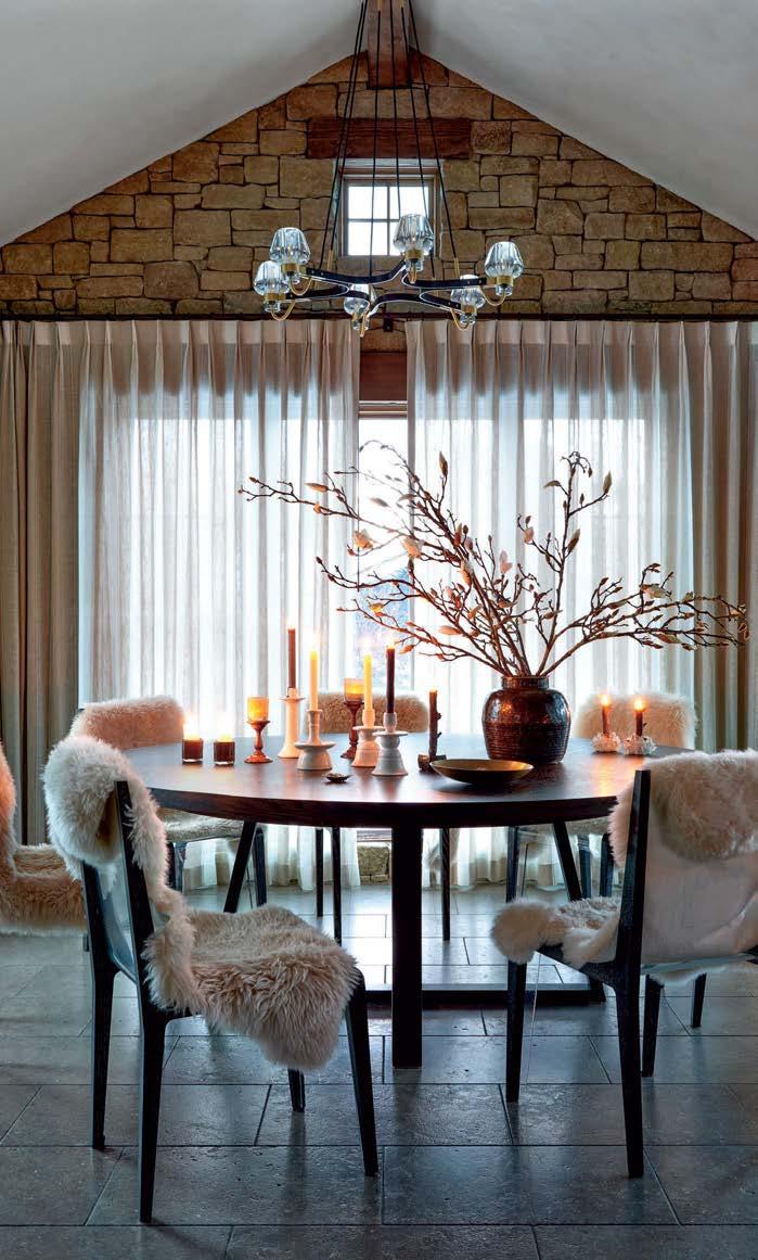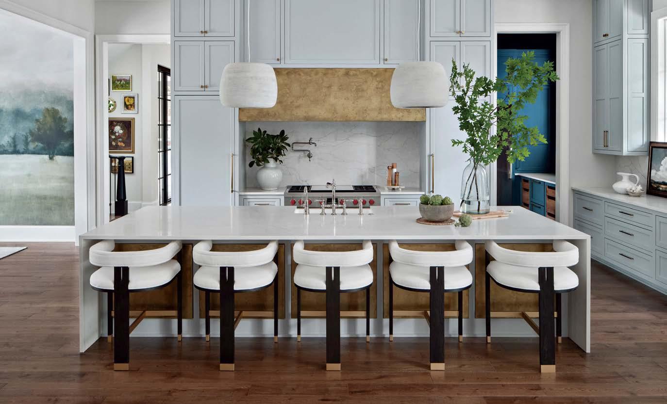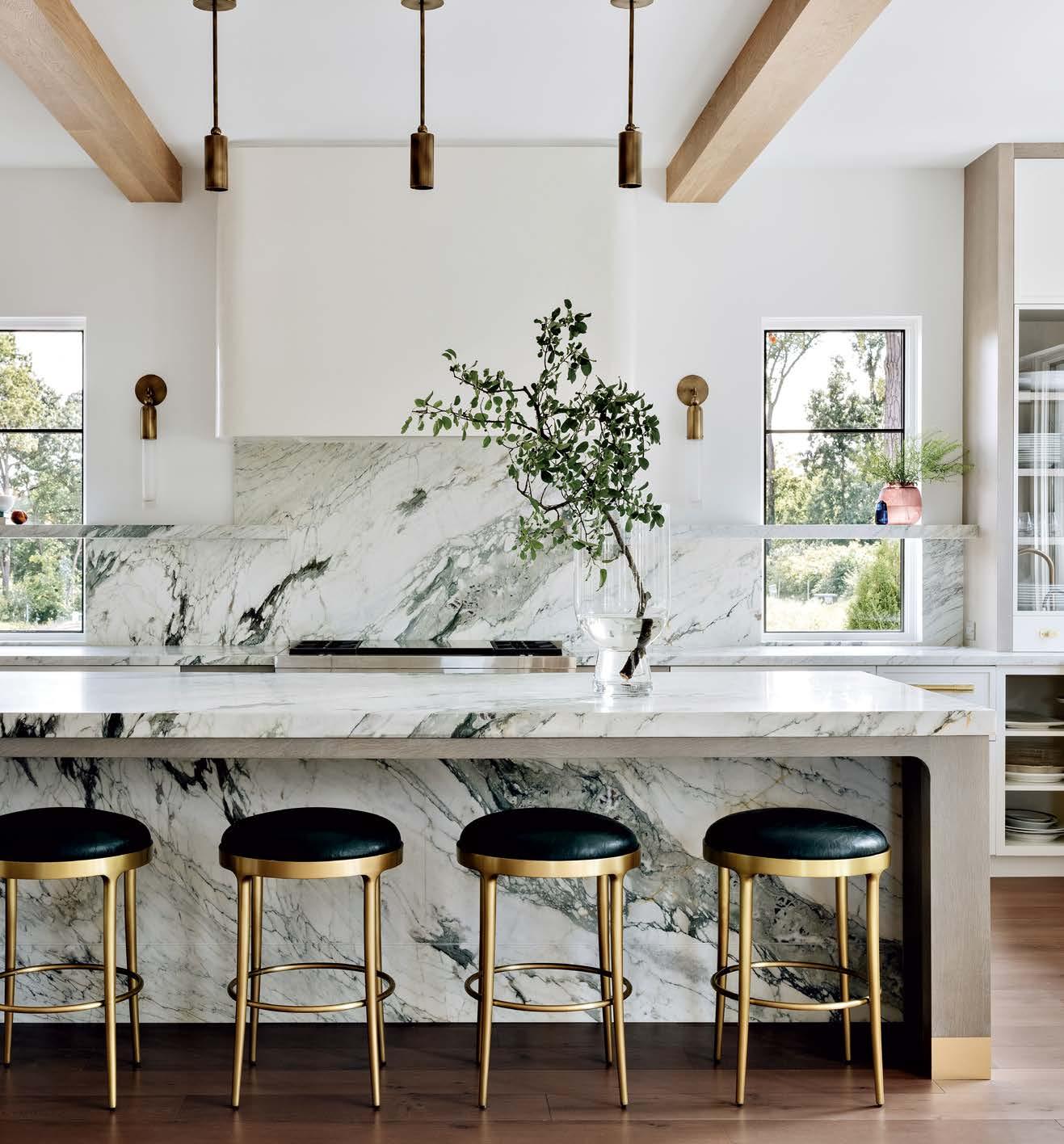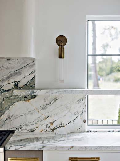 Rosen Lagrange knew that referencing the architecture was key to the interiors. “The way you finish a space has to relate to whatever is happening on the exterior or the time period,” she says. “But we needed it to feel younger. That happened through the furnishings.” Throughout the home, she mixed vintage European finds of a lighter, more relaxed feel with contemporary selects and statement lighting to keep it fresh. Stonework, such as the green-and-burgundyveined marble in the kitchen and the cleanlined violet-accented stone on the living room’s fireplace mantel, adds a modern touch.