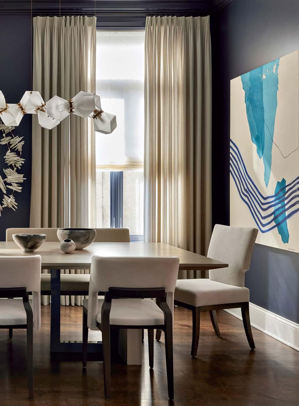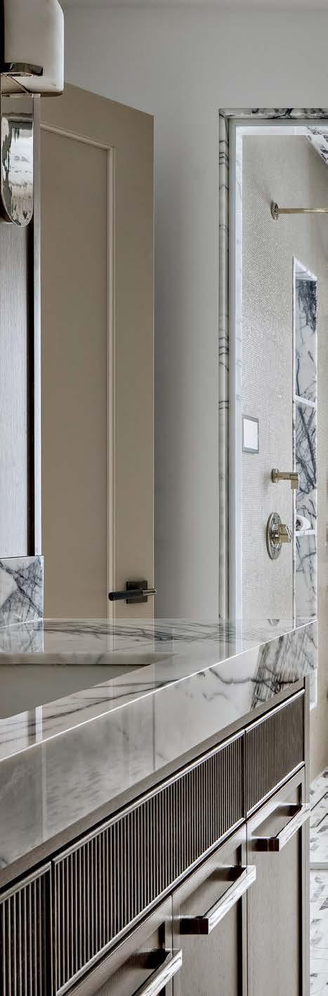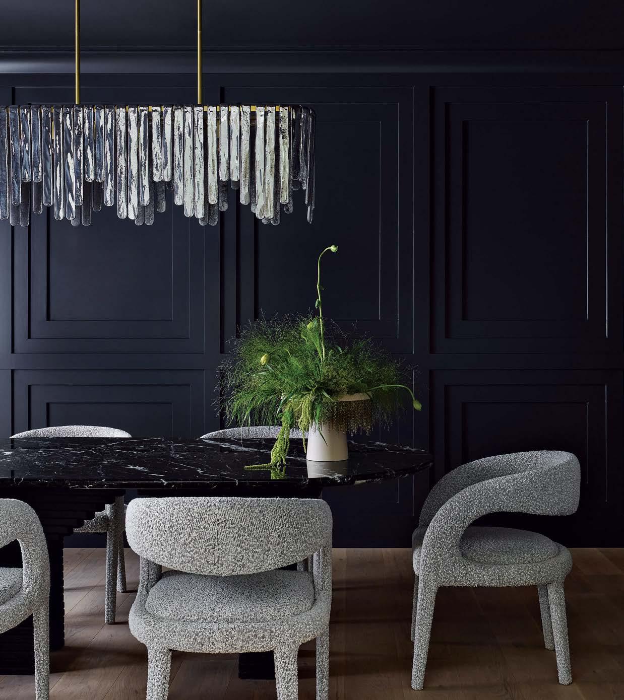 Top Within white surroundings, contrasting furniture grounds this minimalist, open-plan dining room. The light fixture adds a sculptural element. Far left A sophisticated front room in a Bucktown family home is adorned with dark hues and dramatic art by Lonney White. Center This full chef’s kitchen features a large island in order to include the entire family in meal prep. Left A repeat client wanted their primary bathroom to have a masculine aesthetic. Accent lighting highlights the limestone-clad walls.