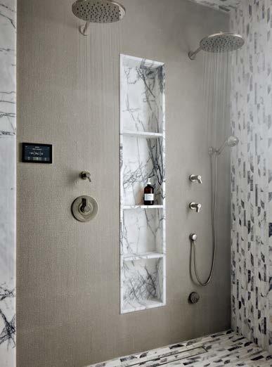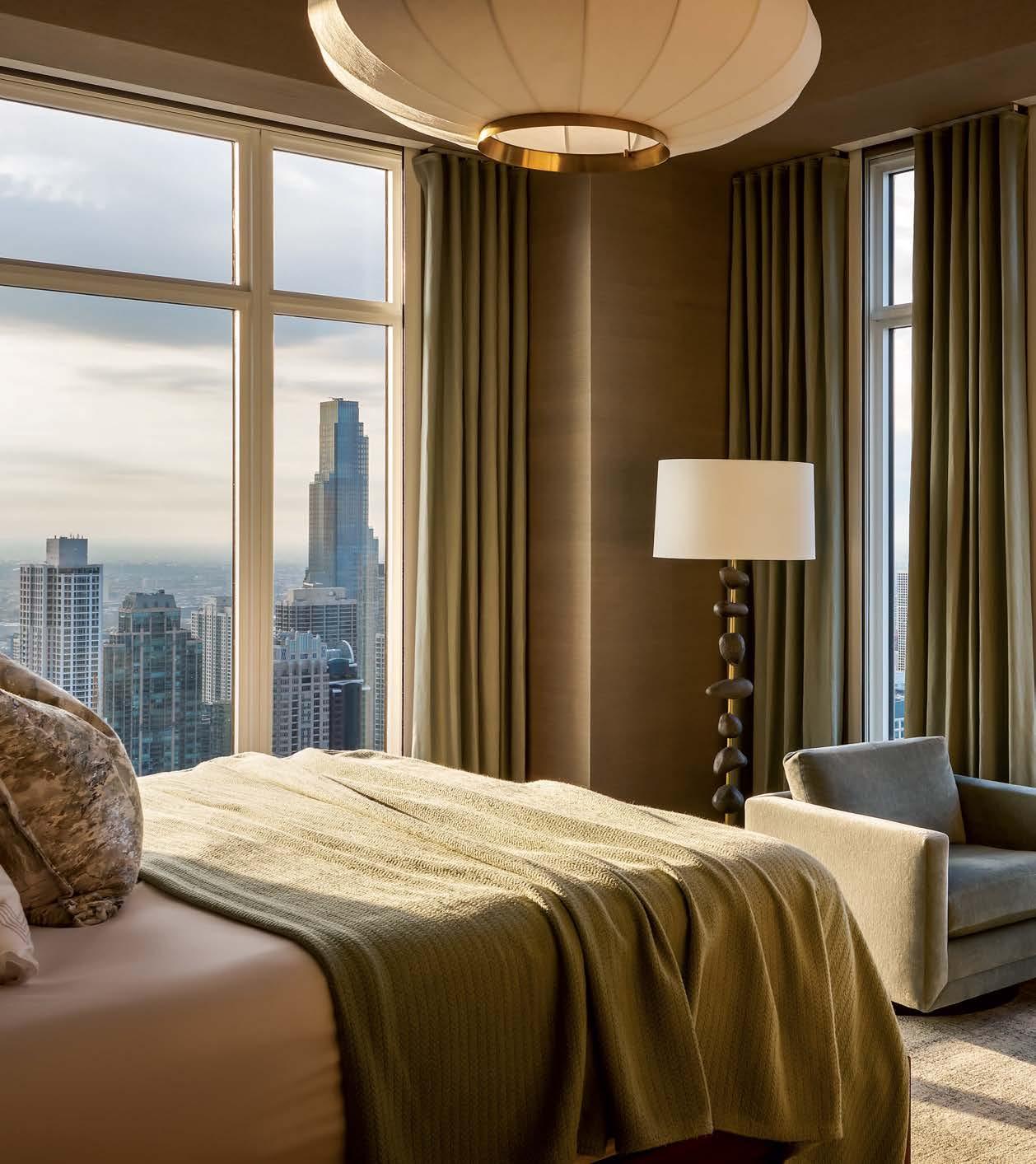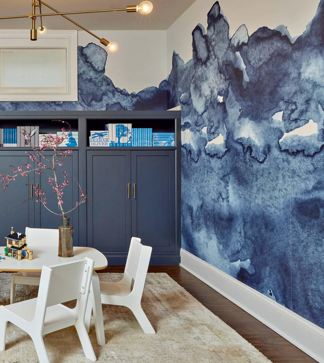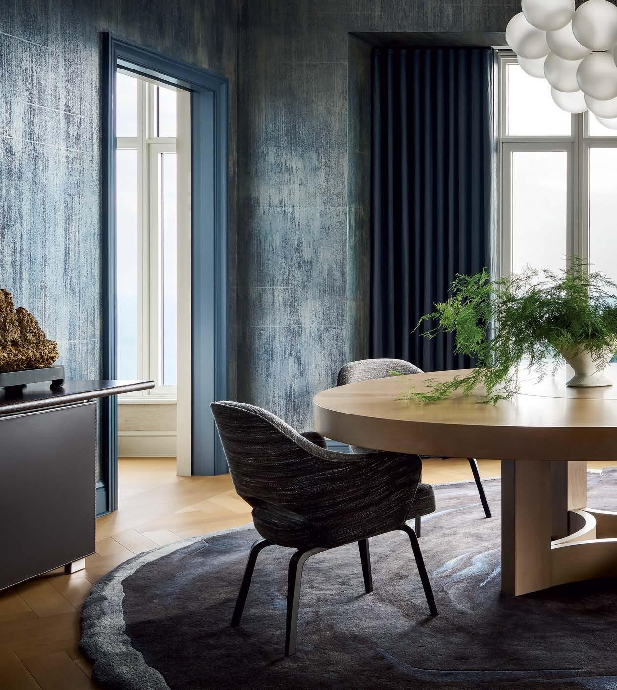 Top Within white surroundings, contrasting furniture grounds this minimalist, open-plan dining room. The light fixture adds a sculptural element. Far left A sophisticated front room in a Bucktown family home is adorned with dark hues and dramatic art by Lonney White. Center This full chef’s kitchen features a large island in order to include the entire family in meal prep. Left A repeat client wanted their primary bathroom to have a masculine aesthetic. Accent lighting highlights the limestone-clad walls.