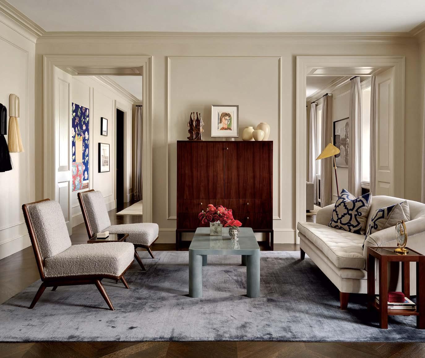 The designer and her husband, Christophe Lagrange—Chicago natives who met as firstyear students at Latin School of Chicago—were seeking a spacious vintage diamond-in-the-rough that they could renovate to their exacting vision. Both have personal expertise on the matter: Rosen Lagrange grew up in a historic Gold Coast building, while Christophe—the son of an architect and interior designer—was raised in a Louis Sullivan-designed home in Lincoln Park. Fans of classical architecture, when the couple found this full-floor co-op with windows on all sides, they saw potential—along with views of Lake Michigan and the landmark “Cardinal’s Mansion,” the city’s legendary Queen Anne-style archbishop’s residence. The pair tapped architect Steve Rugo, a longtime friend who’s worked on numerous projects with both families, to help them bring their vision to life. “Steve was like our architectural historian,” Christophe says. “We knew he would be able to pull out the right trim details and baseboard profiles and have appropriate historical references for balance and scale.”