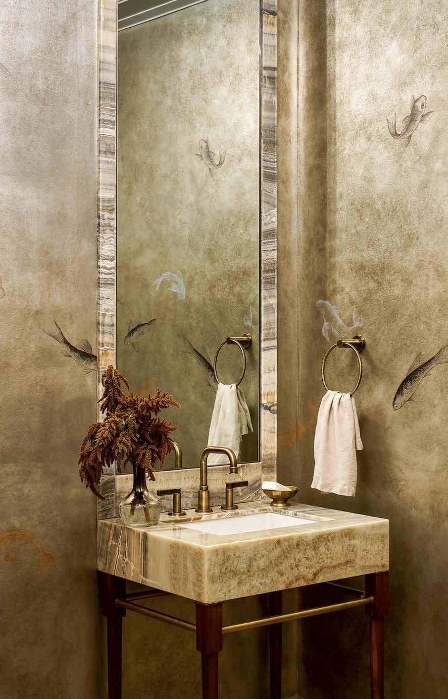 Above: Calacatta Macchia Vecchia marble slabs from Campolonghi are enhanced by the powder room’s de Gournay wallcovering on douppioni silk. The custom vanity by Tithof Tile & Marble showcases a sink and faucet by Waterworks.