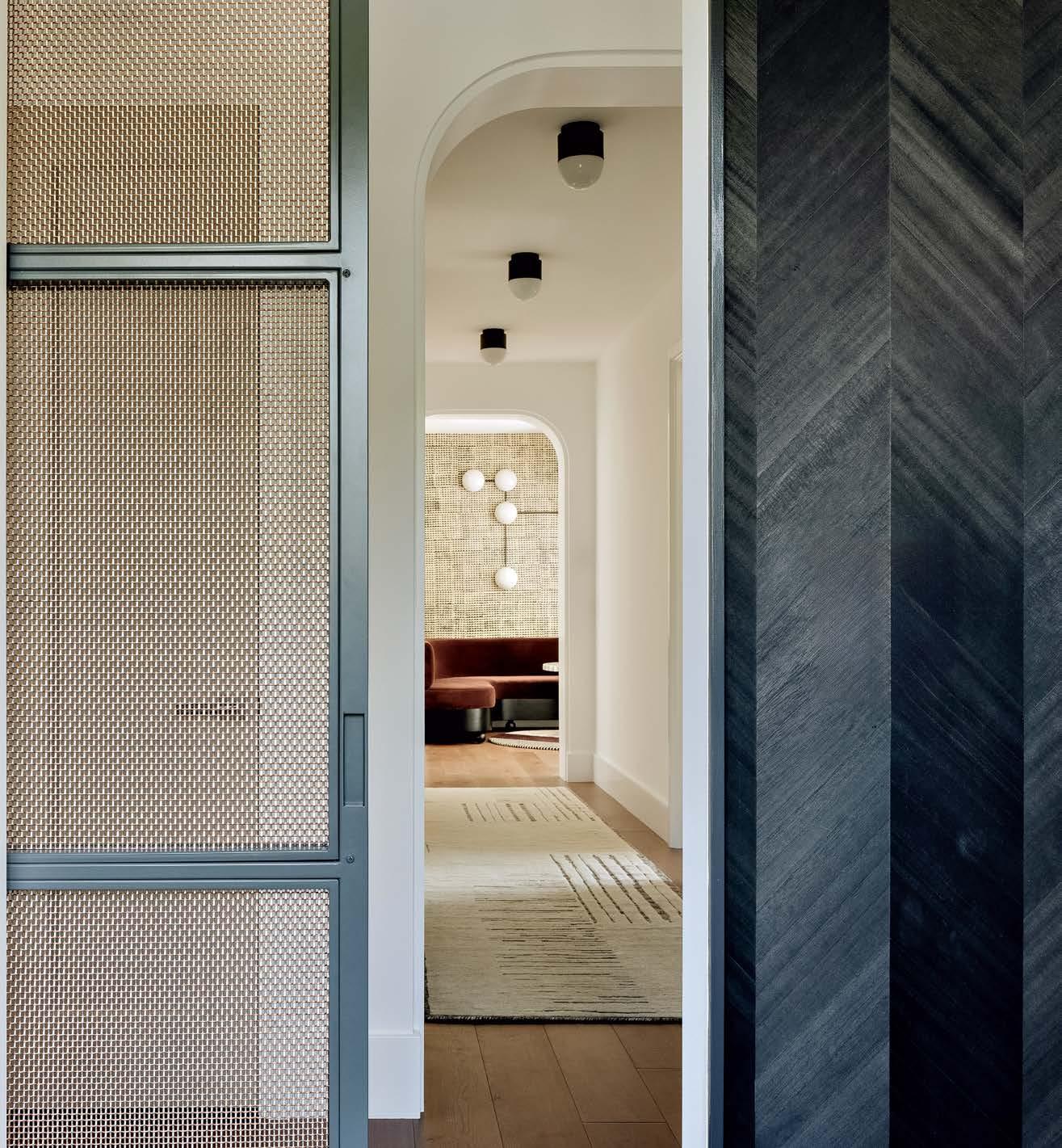 While the saturated hues Rosen Lagrange adores can be found throughout the home, “some rooms needed an even stronger point of view,” she says—most notably, the dining room. After all, the couple loves to entertain, with Christophe often cooking 10-course meals for their guests. The space’s glossy aubergine millwork is tempered with traditional details, like dentil crown molding, and rich layers, including the walnutand-bronze dining table and silk wallpaper on the ceiling. “That dining room was one of the best decisions we made in the apartment,” Christophe says. Rosen Lagrange agrees. “It always feels cozy and kind of sexy,” she says. “It’s even better at the end of the night, when the candles have dripped all over the tabletop and there’s a mess of red wine glasses. It’s a vibe.”