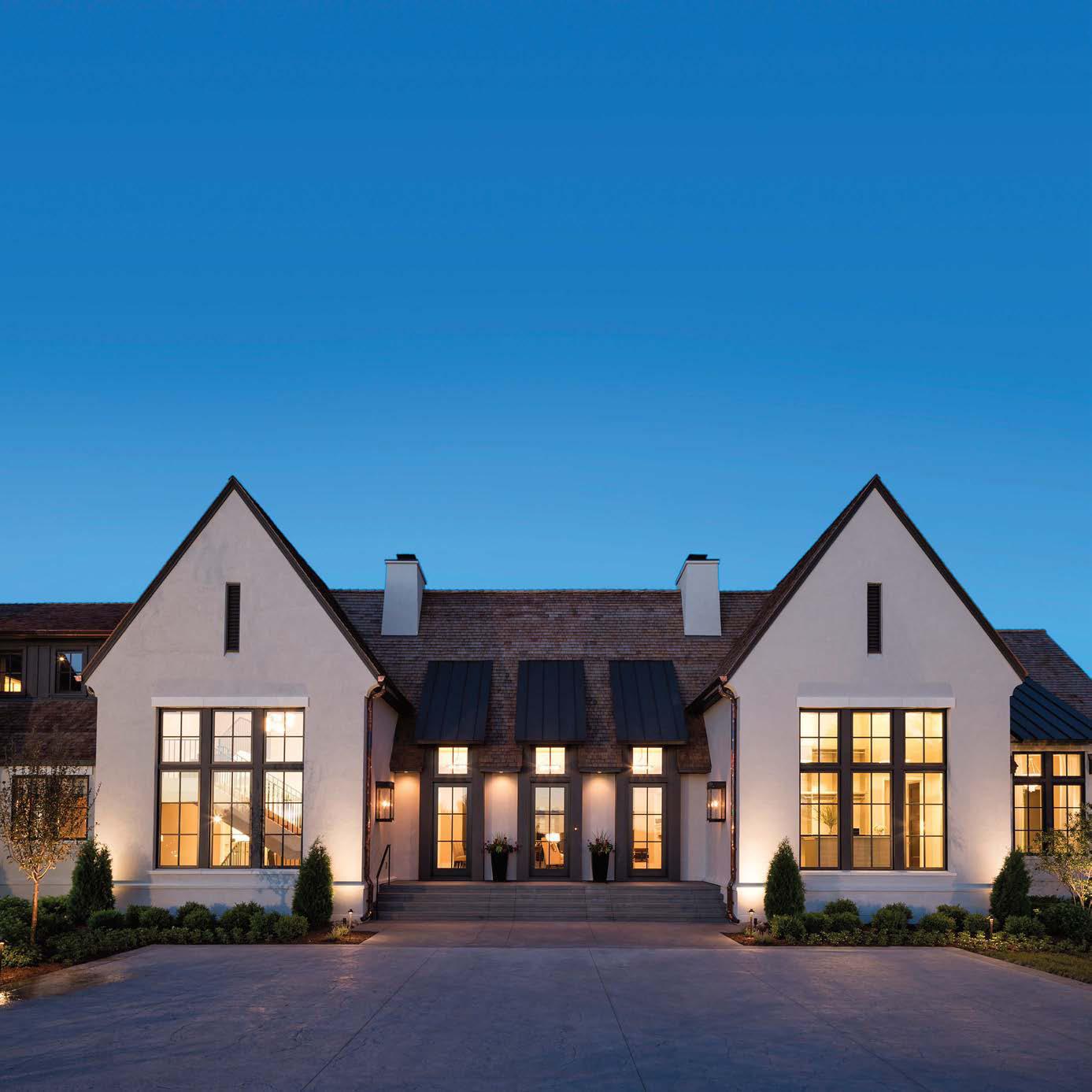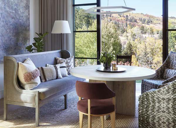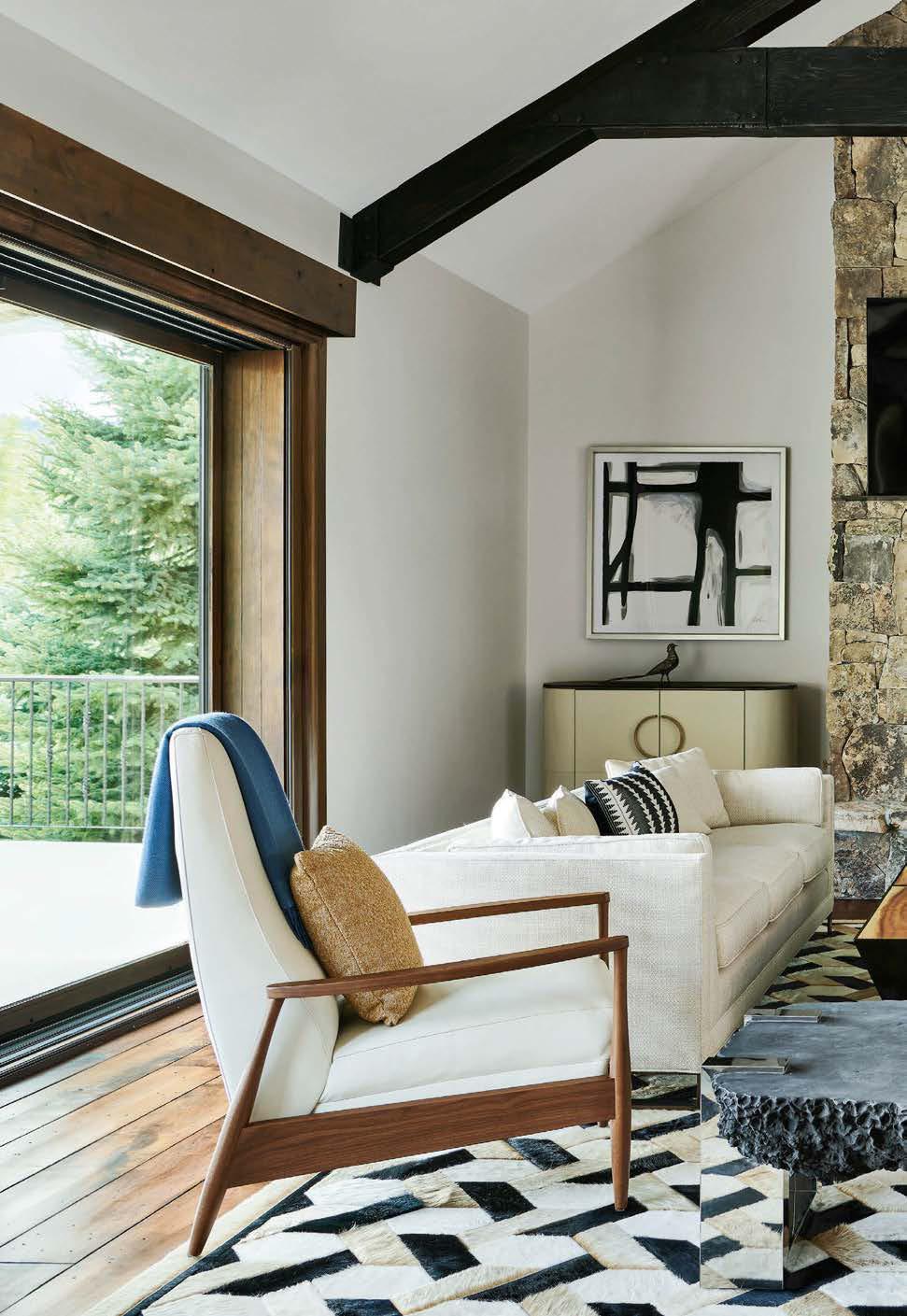ON THE COVER: In the living room of an abode with interiors by Aspen Design House, Baker’s Surround sofas and American Leather’s Aaron recliners, as well as a pair of coffee tables—a custom model by the designers and Trapezoid by Phillips Collection—create a cozy grouping. Charlotte Morgan’s “Black and Blanc” series flanks the fireplace. Page 170