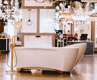 Above This custom-designed limestone fireplace surround is composed of a hand-crafted mantle and artwork sculpted from Plaster of Paris. Top “The IDC building is the gateway to inspiration,” Herlory adds. “The building was finished in collaboration with the showrooms: floors, walls, lighting and more all appointed with products we represent.” Left IDC’s sales associates “strive to educate, inspire and serve the client’s best interests,” says Herlory. Seen here, part of their vast selection of sinks and faucets.