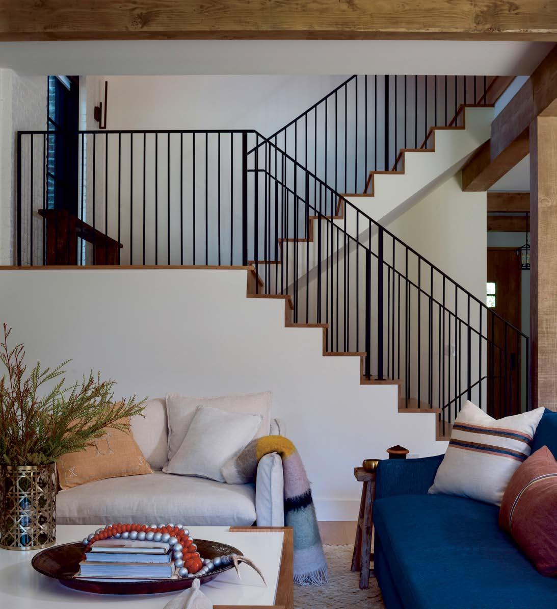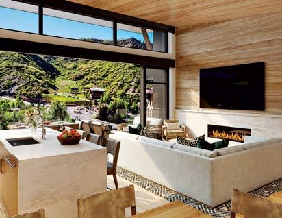 They called in architect Ramsey Fulton, whom they had met through friends, to tackle the challenges inherent to the steep site. He conceived a structure that is entered from above and tiers down along the property. “It’s a really amazing spot, but the trick was to go from higher to lower without it feeling contrived or forced, and to do so in a way that would feel like an experience rather than a necessity,” he explains. He looked to the setting for inspiration. The house’s understated swooping façade, perched low on the land, takes its cues from the surrounding ridgelines, while the wood-andstone exterior merges with the landscape. Inside, the transition from larger, open public rooms down to more intimate private spaces mimics the undulation of a mountain hike—where expansive vistas at the apex give way to a low forest canopy below. The gentle northern light that suffuses the interior creates a sanctuarylike feel, while a vast use of glass keeps the focus on astonishing views that stretch as far as the Aspen and Smuggler mountains.