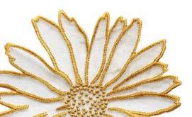 A fascination with nature and botanicals is clear in artist Eileen Roscina’s flower-filled works. For instance, Iris (opposite) features a ring of pressed flowers set in resin. Queen Anne’s lace, wild roses, calendula, larkspur and dried citrus are the building blocks of her current pieces, some assembled atop mirrored backgrounds (bottom).
