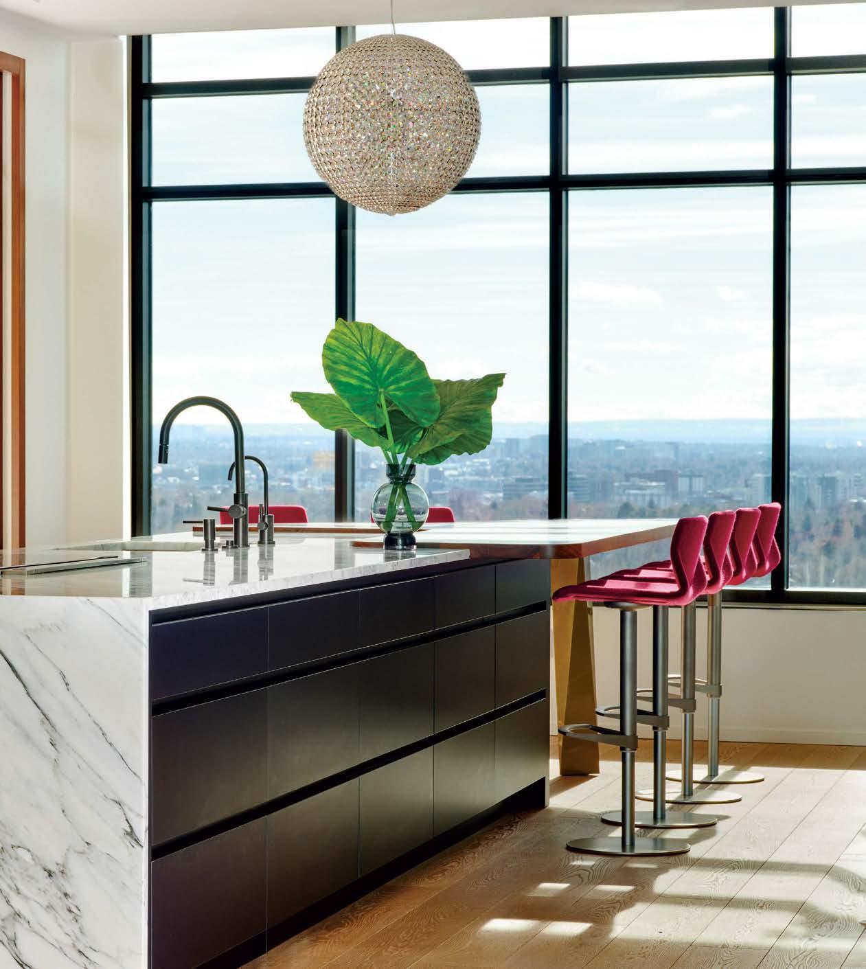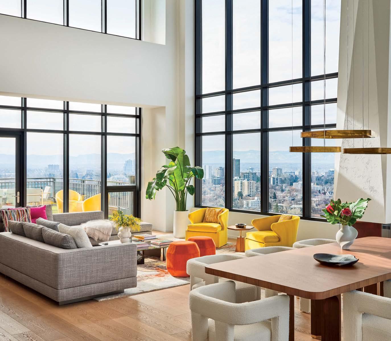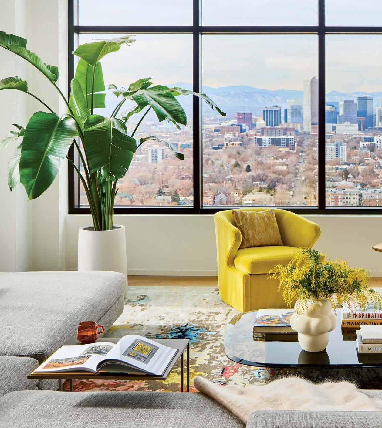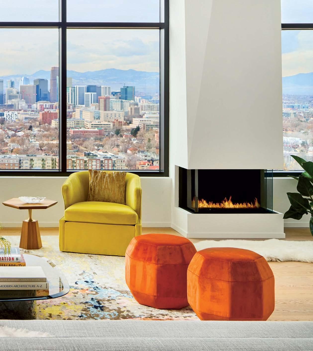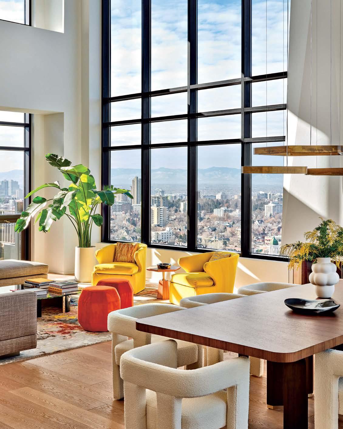 The jaw-dropping sight of downtown Denver backed by the mountains from Pikes Peak all the way to Longs Peak is unmistakably what first commands attention in Mark and Maria Pearson’s penthouse near City Park. A very close second? Their home’s daring use of vibrant colors. Citrus hues drench the living area’s lounge chairs and ottomans, a primary palette joyfully pingpongs through a family room and pink stools pop beside a rich walnut table and cabinetry in the kitchen. The saturated hues feel fun and fresh, but also read as elevated and mature against the quieter beauty of white walls, warm woods, natural stone and an array of neutral furnishings. The homeowners themselves drove the colorrich interior scheme—“We love strong hues like orange, red and yellow,” confirms Mark—but designer Anne Marie Ostmeyer determined the just-right balance throughout the residence. “The shades sing so much more because they’re in the furnishings and not in all the finishes,” Ostmeyer explains of her strategy.