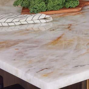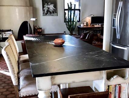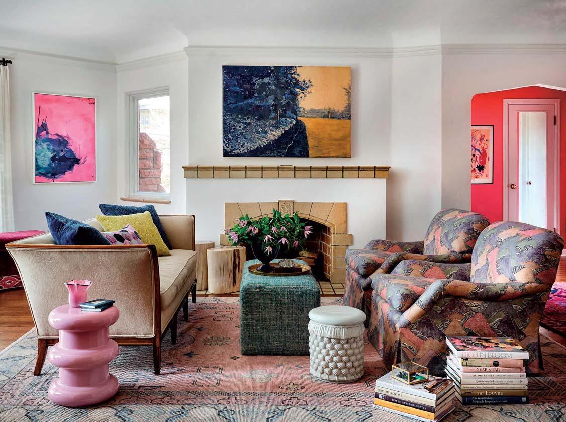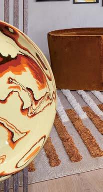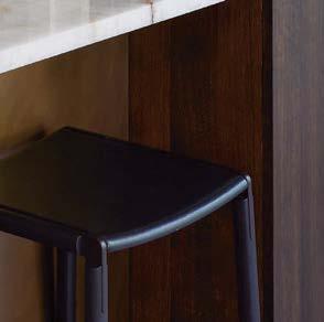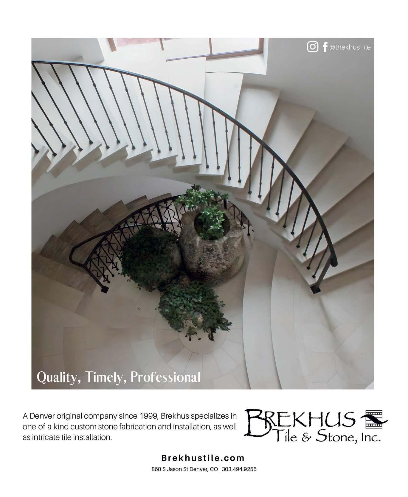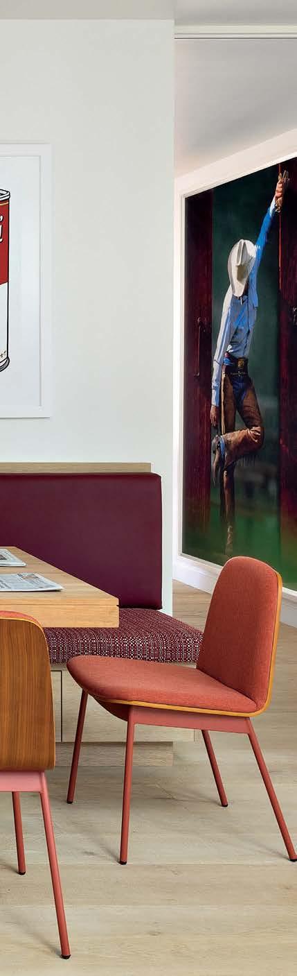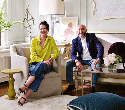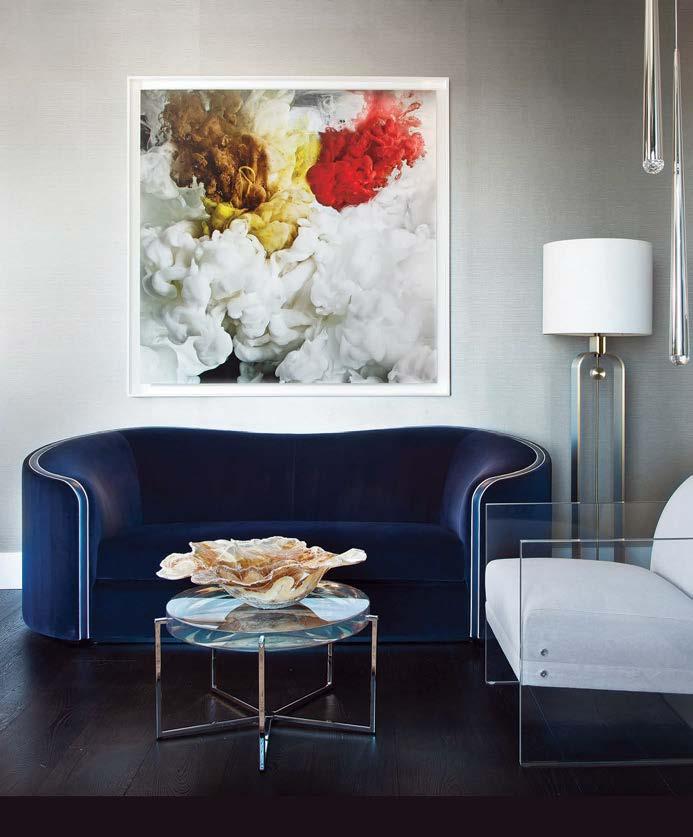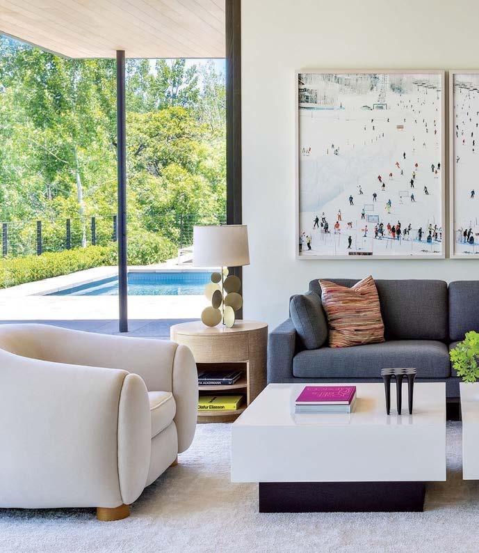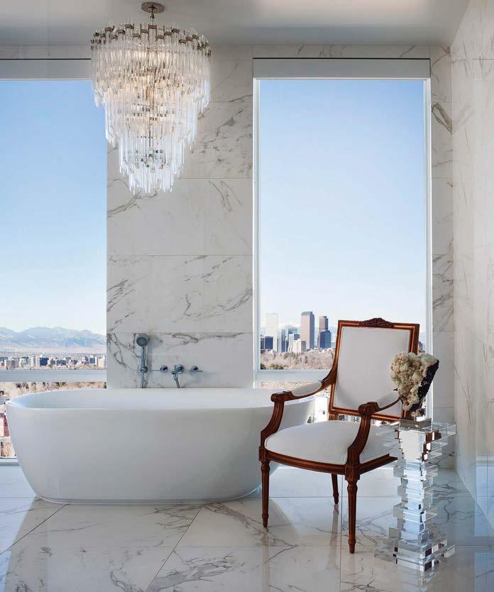 The jaw-dropping sight of downtown Denver backed by the mountains from Pikes Peak all the way to Longs Peak is unmistakably what first commands attention in Mark and Maria Pearson’s penthouse near City Park. A very close second? Their home’s daring use of vibrant colors. Citrus hues drench the living area’s lounge chairs and ottomans, a primary palette joyfully pingpongs through a family room and pink stools pop beside a rich walnut table and cabinetry in the kitchen. The saturated hues feel fun and fresh, but also read as elevated and mature against the quieter beauty of white walls, warm woods, natural stone and an array of neutral furnishings. The homeowners themselves drove the colorrich interior scheme—“We love strong hues like orange, red and yellow,” confirms Mark—but designer Anne Marie Ostmeyer determined the just-right balance throughout the residence. “The shades sing so much more because they’re in the furnishings and not in all the finishes,” Ostmeyer explains of her strategy.