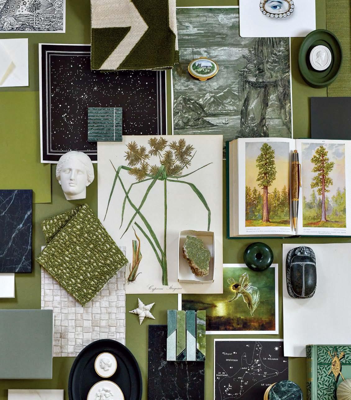 Layered mood boards by stylist and photographer Robin Verrier feature trending color combinations alongside the newest fabrics, wallpapers, trims and tiles.