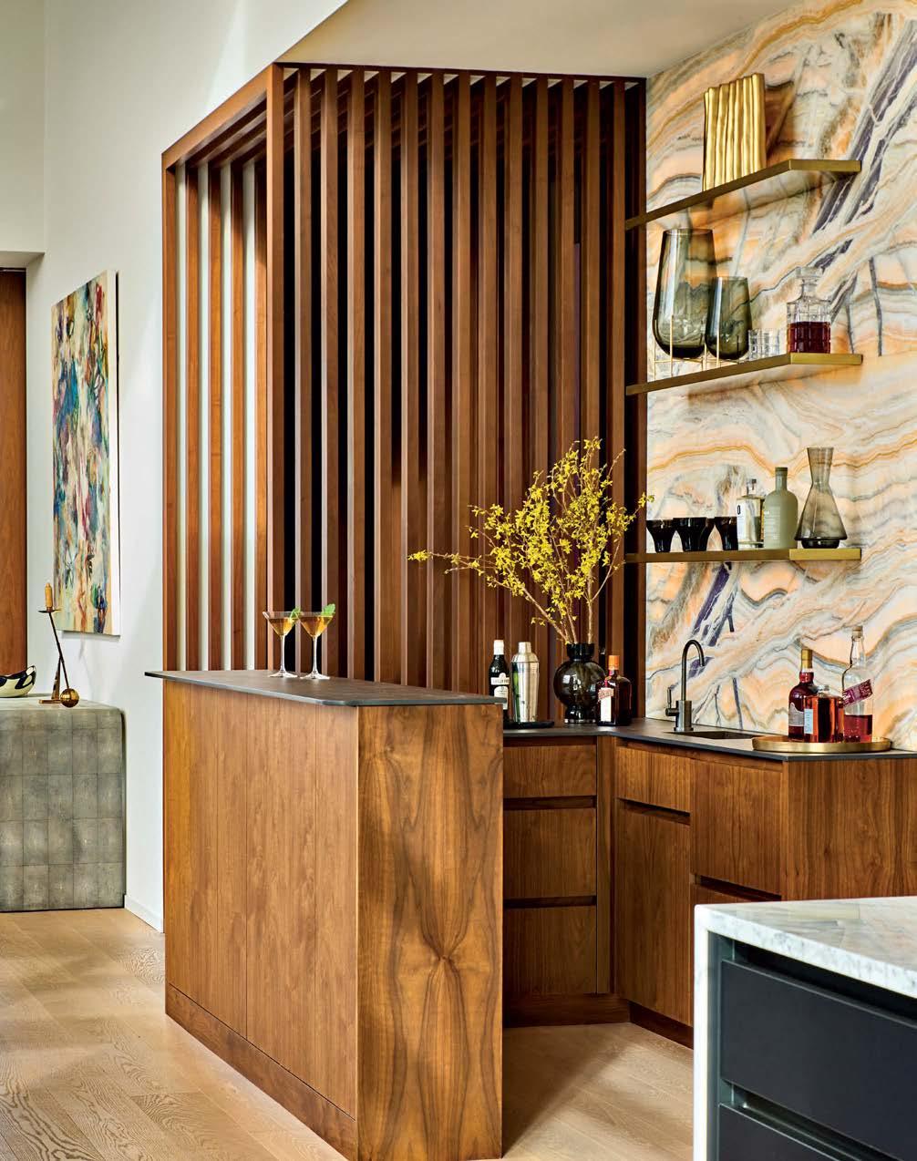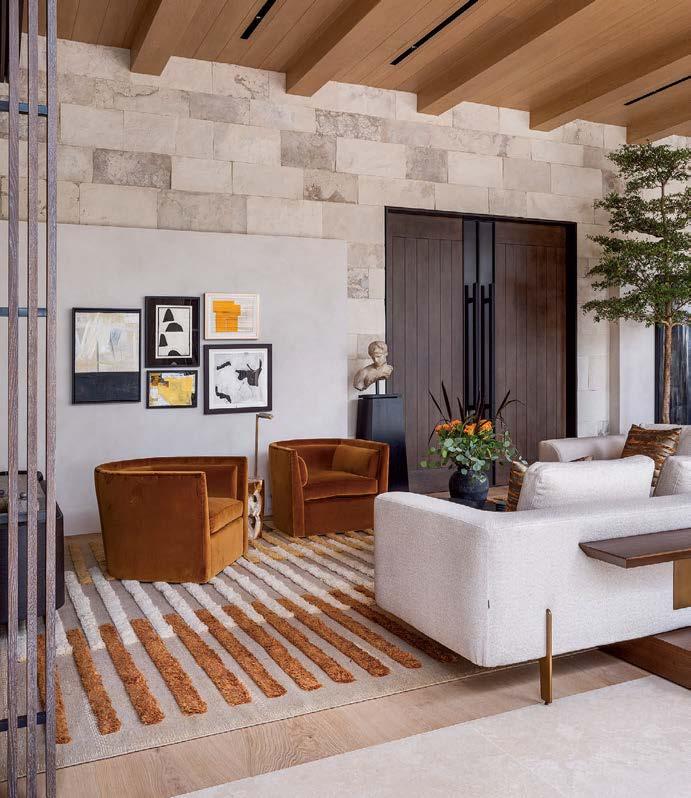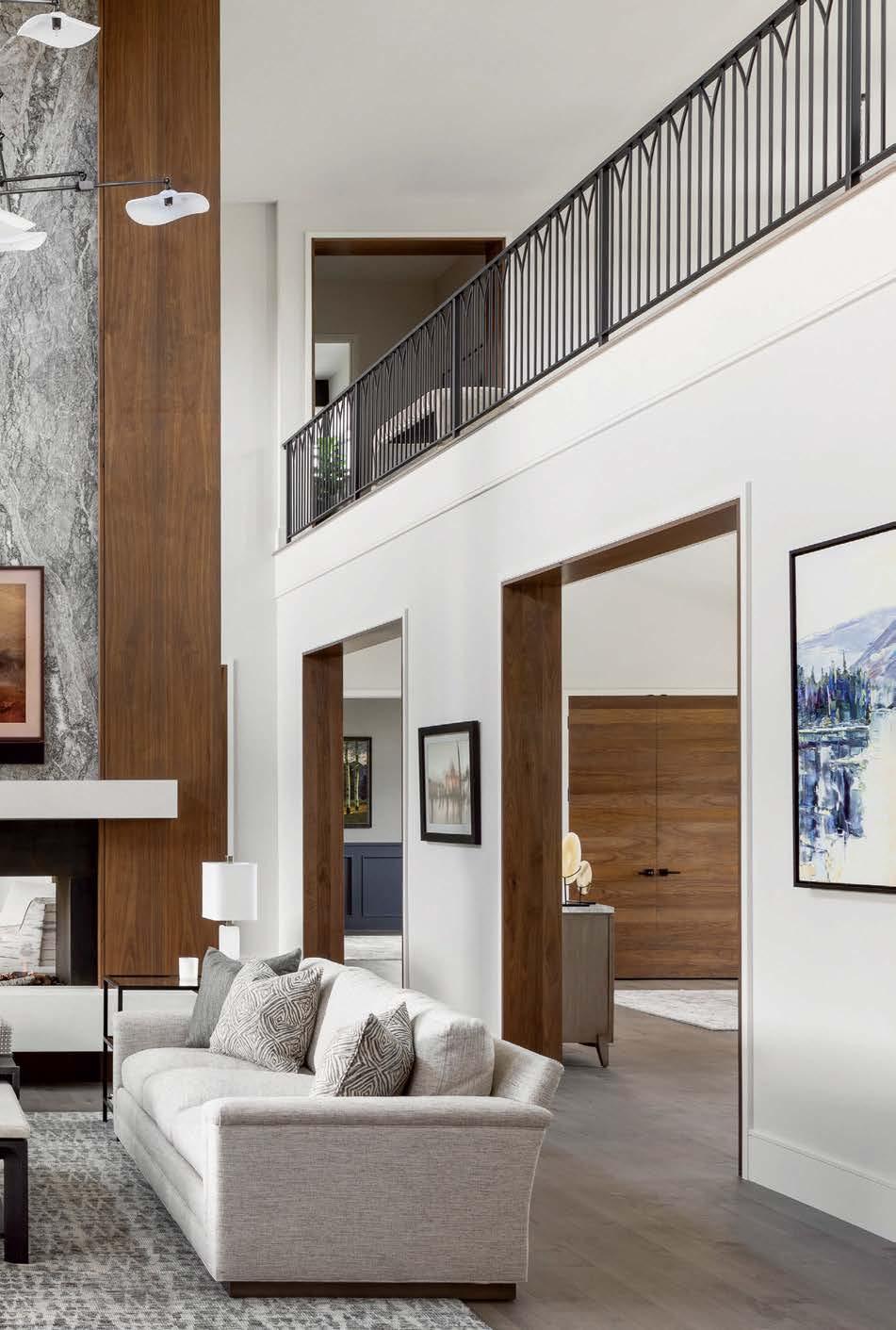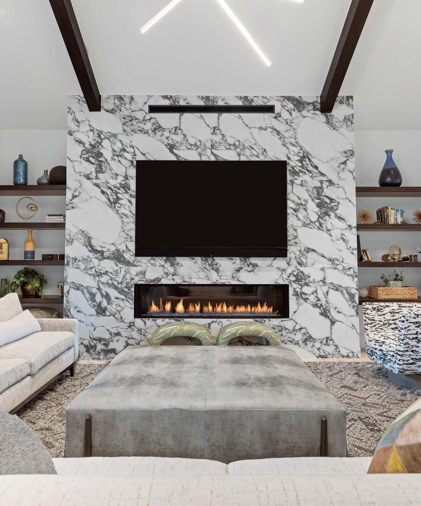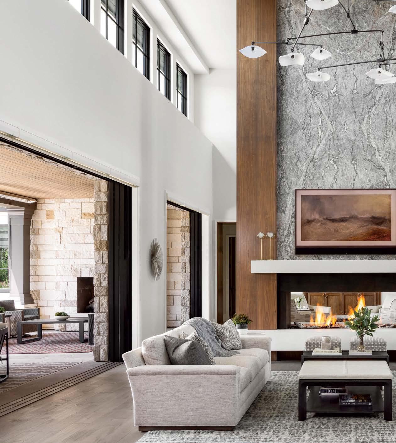 center. Encased within two columns of walnut, bookmatched gray-tone marble slabs rise up to the ceiling, hovering over an airy living area, while a more intimate sitting room awaits on the fireplace’s opposite side. “This was an opportunity for a big wow moment,” Ekle describes. “The effect is warm, inviting and infuses rich materials in a sleek and contemporary way.”