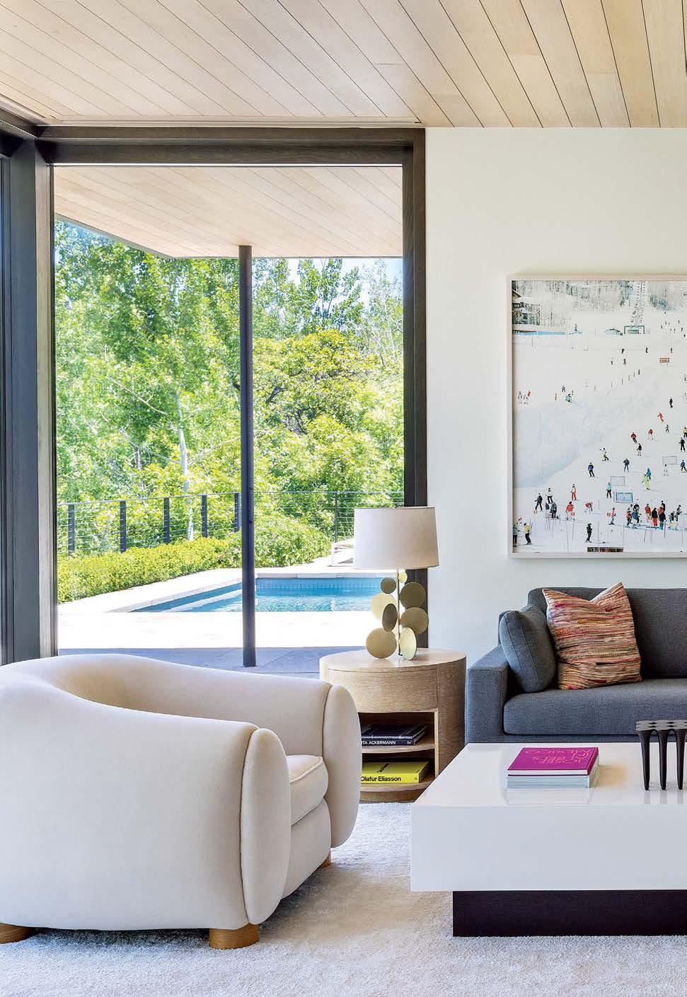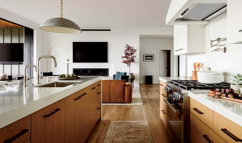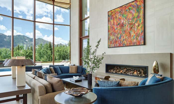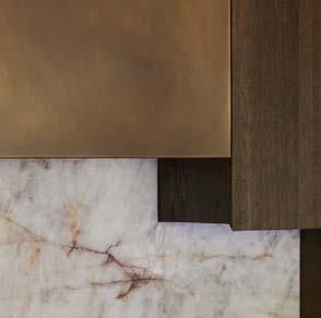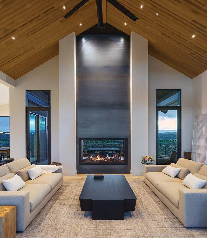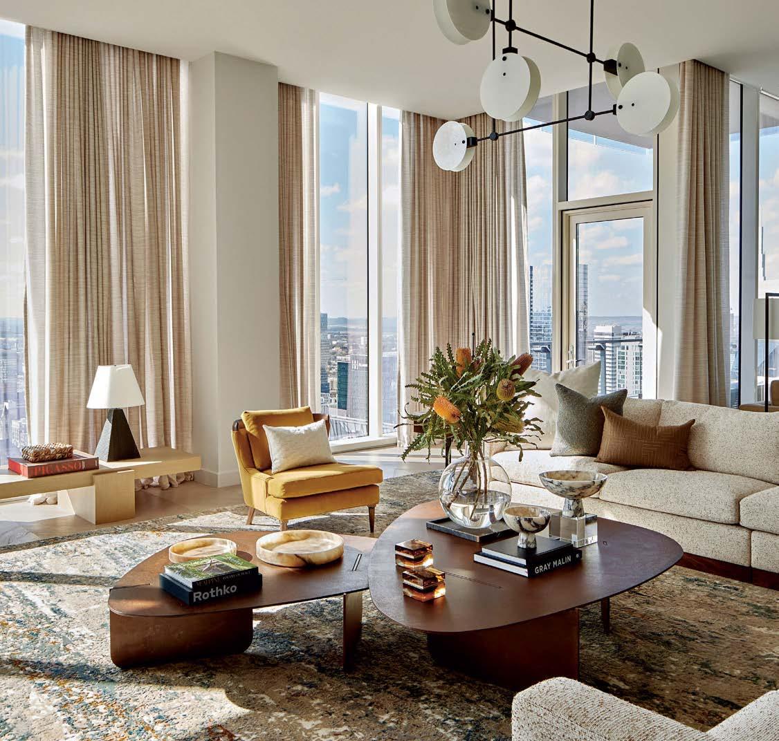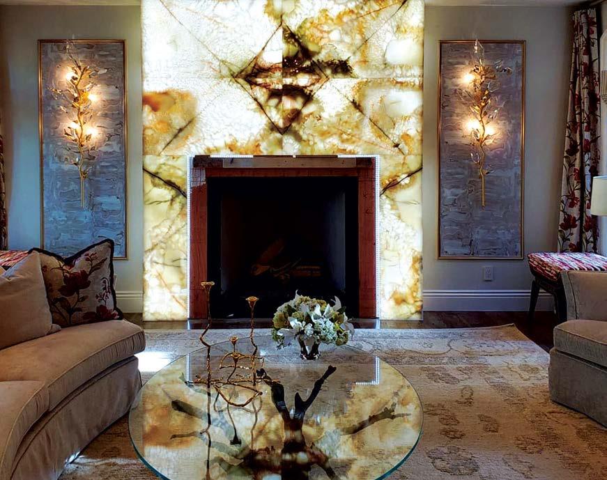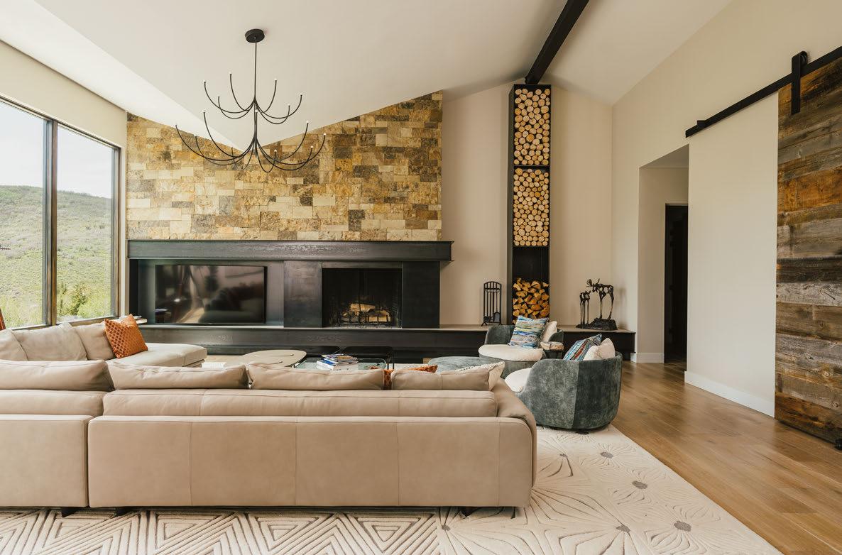 center. Encased within two columns of walnut, bookmatched gray-tone marble slabs rise up to the ceiling, hovering over an airy living area, while a more intimate sitting room awaits on the fireplace’s opposite side. “This was an opportunity for a big wow moment,” Ekle describes. “The effect is warm, inviting and infuses rich materials in a sleek and contemporary way.”