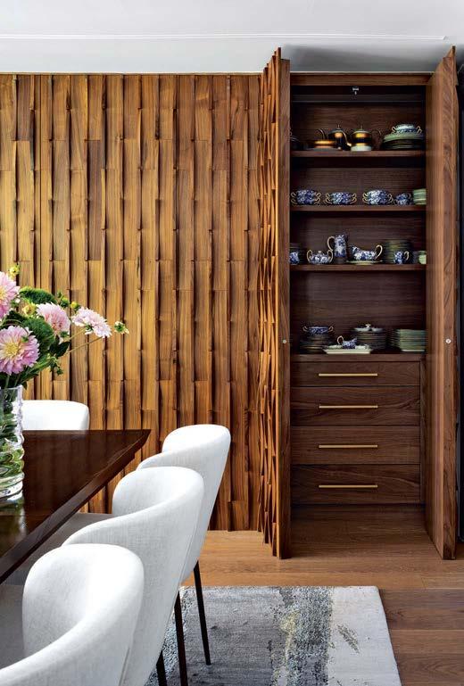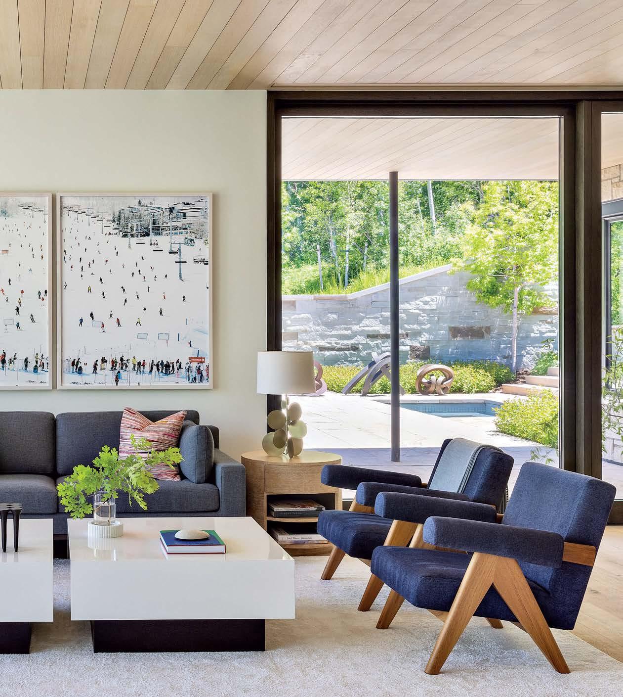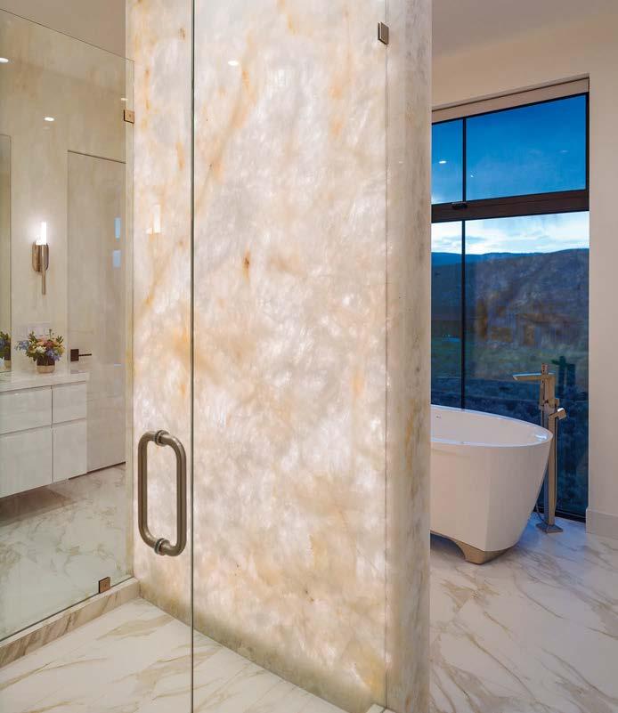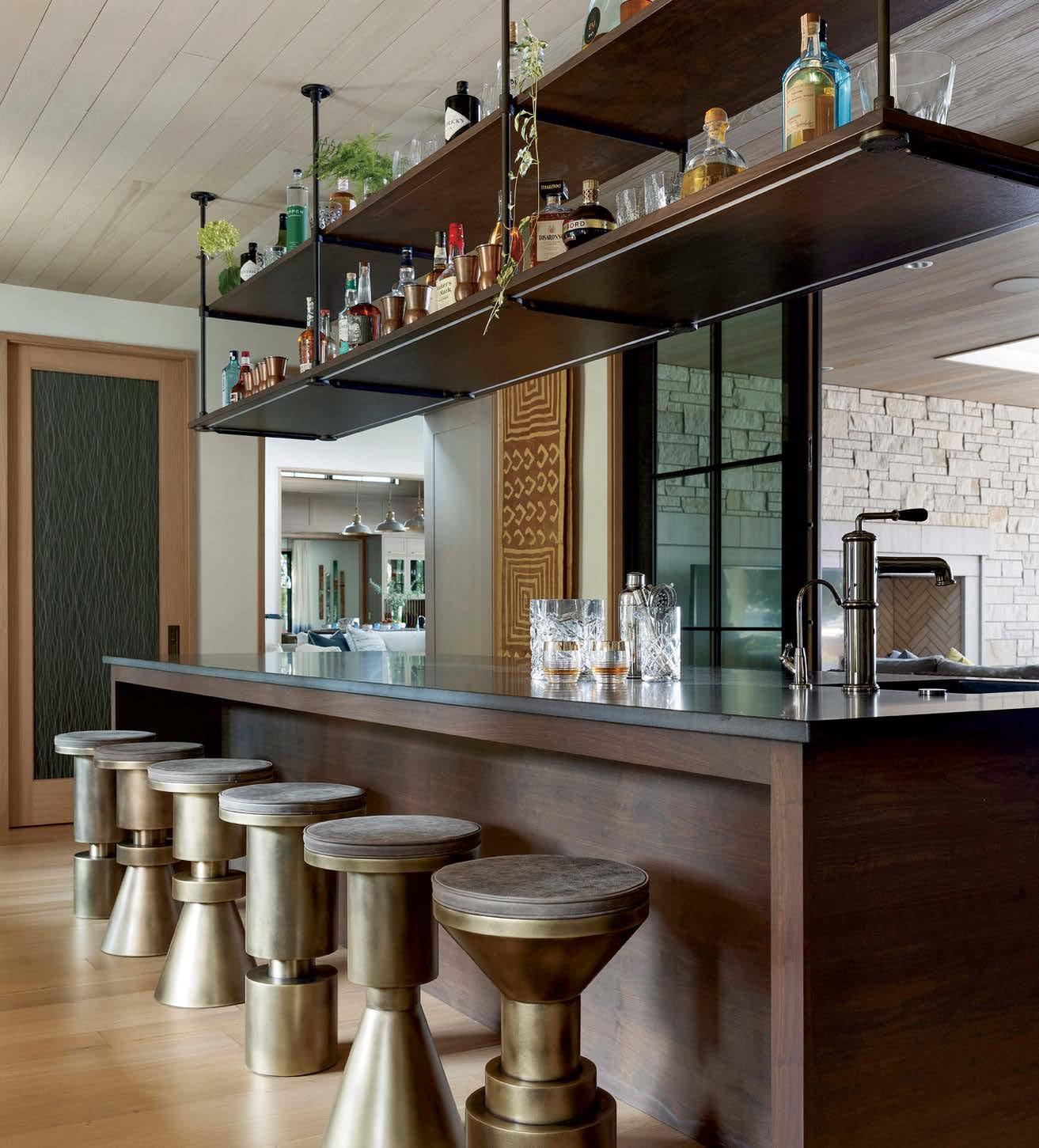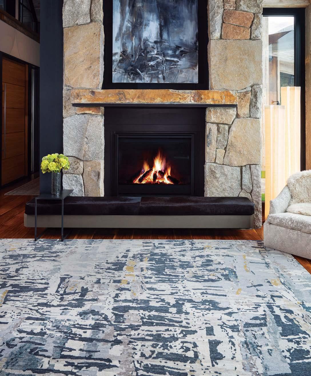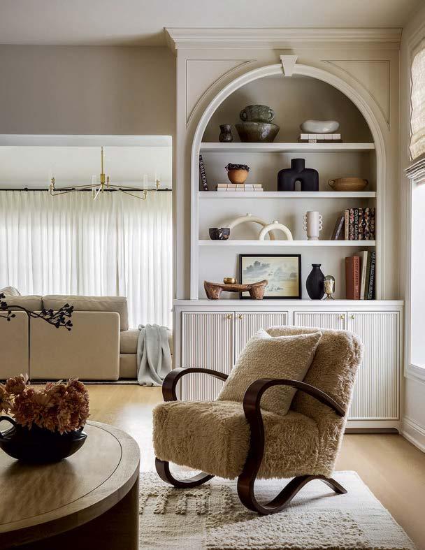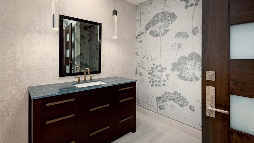 center. Encased within two columns of walnut, bookmatched gray-tone marble slabs rise up to the ceiling, hovering over an airy living area, while a more intimate sitting room awaits on the fireplace’s opposite side. “This was an opportunity for a big wow moment,” Ekle describes. “The effect is warm, inviting and infuses rich materials in a sleek and contemporary way.”