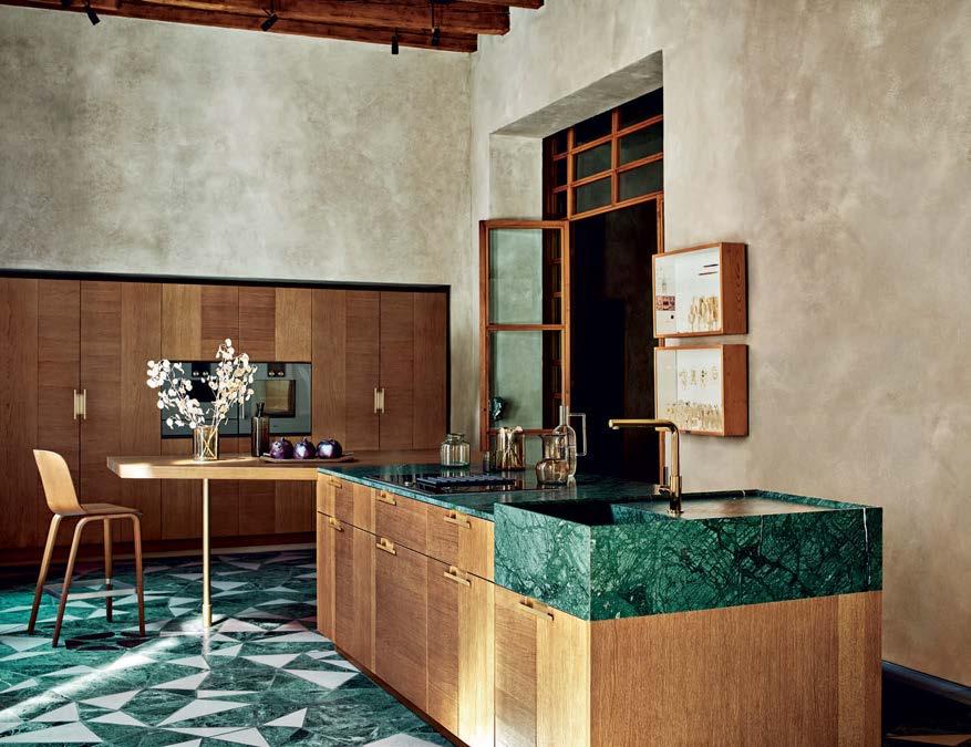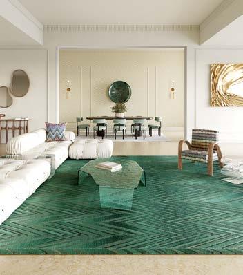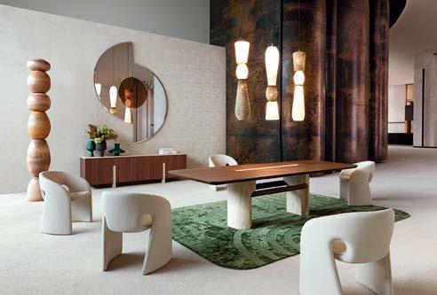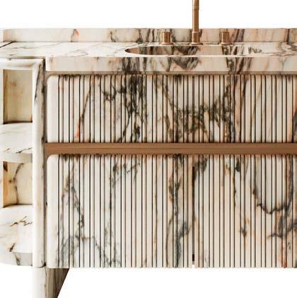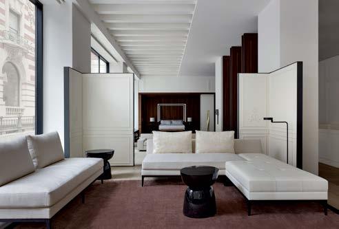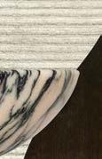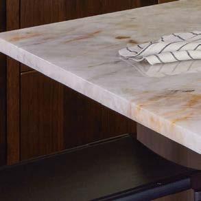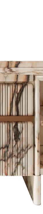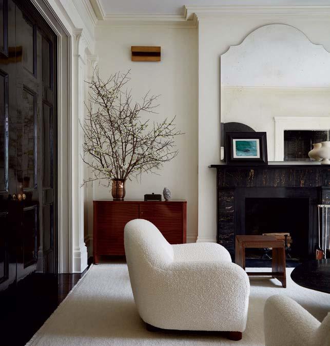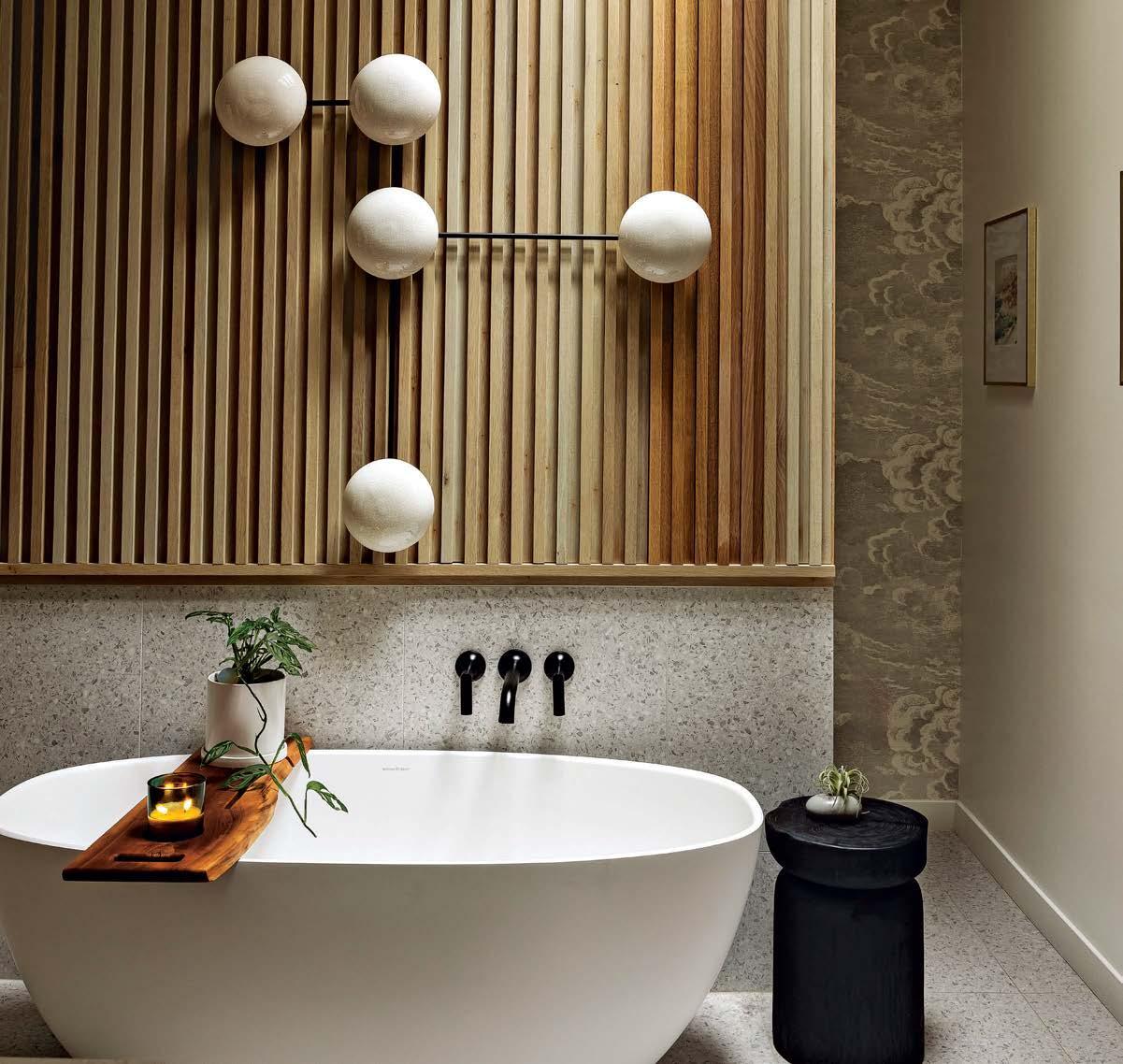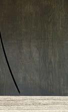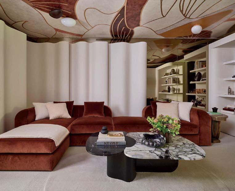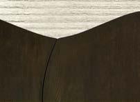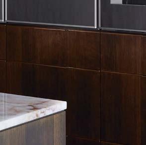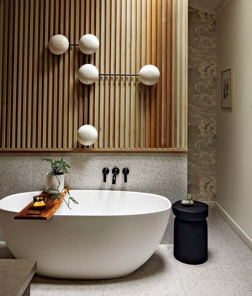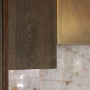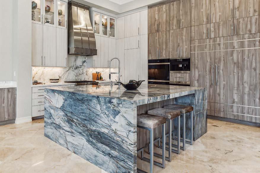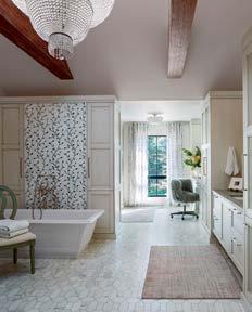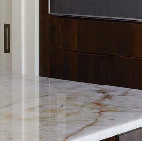 center. Encased within two columns of walnut, bookmatched gray-tone marble slabs rise up to the ceiling, hovering over an airy living area, while a more intimate sitting room awaits on the fireplace’s opposite side. “This was an opportunity for a big wow moment,” Ekle describes. “The effect is warm, inviting and infuses rich materials in a sleek and contemporary way.”