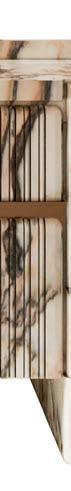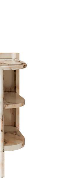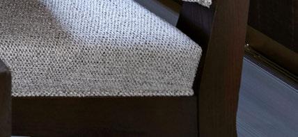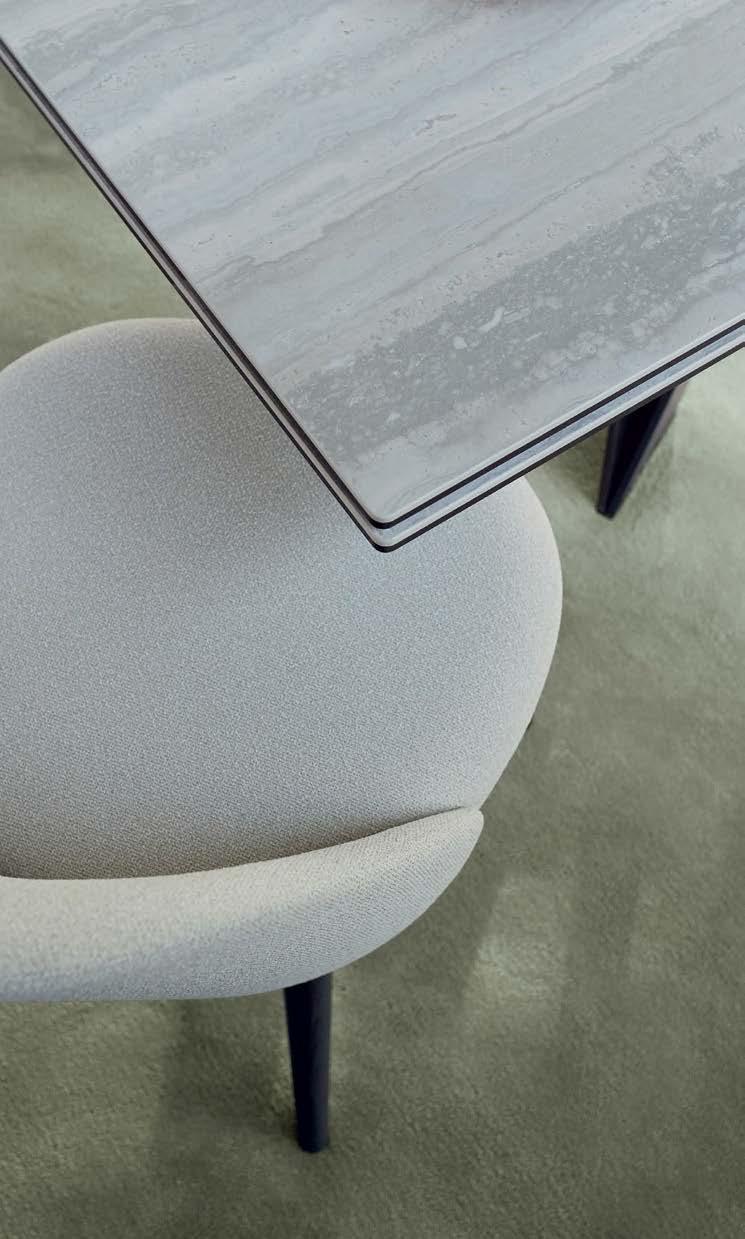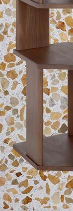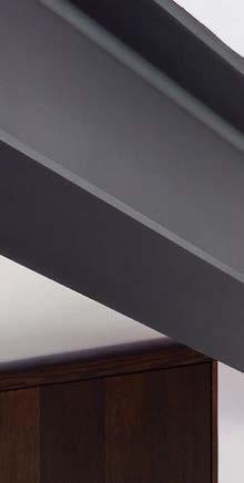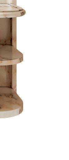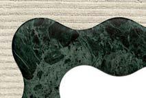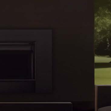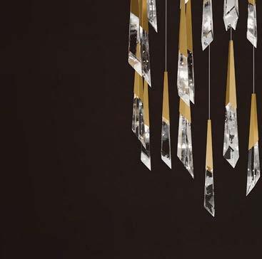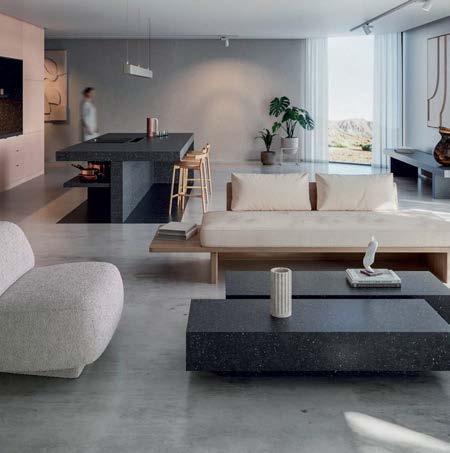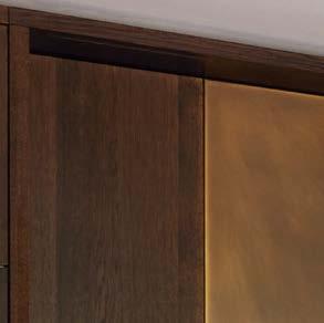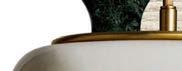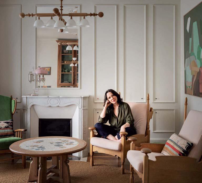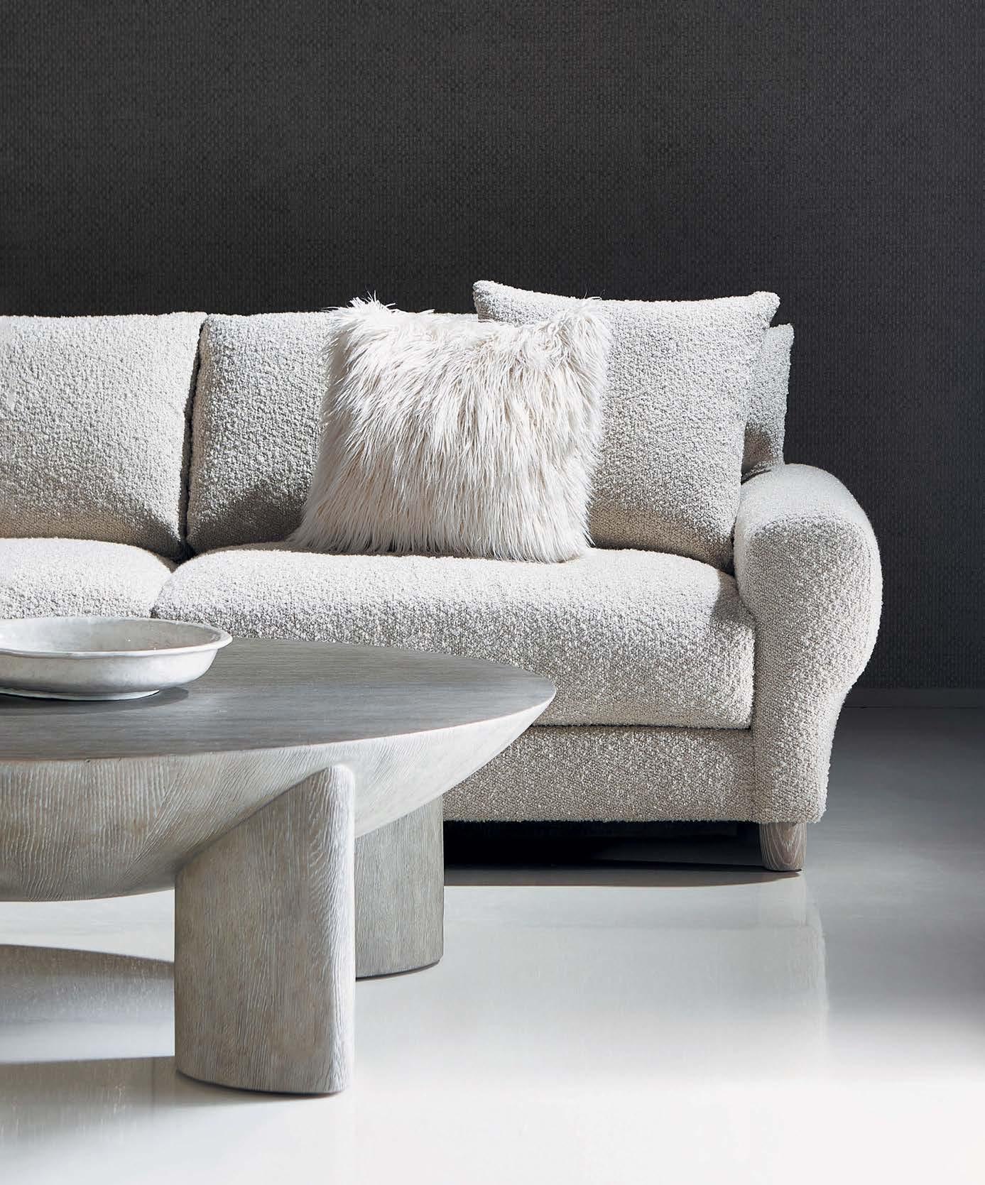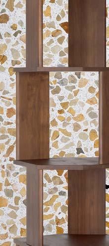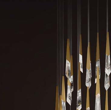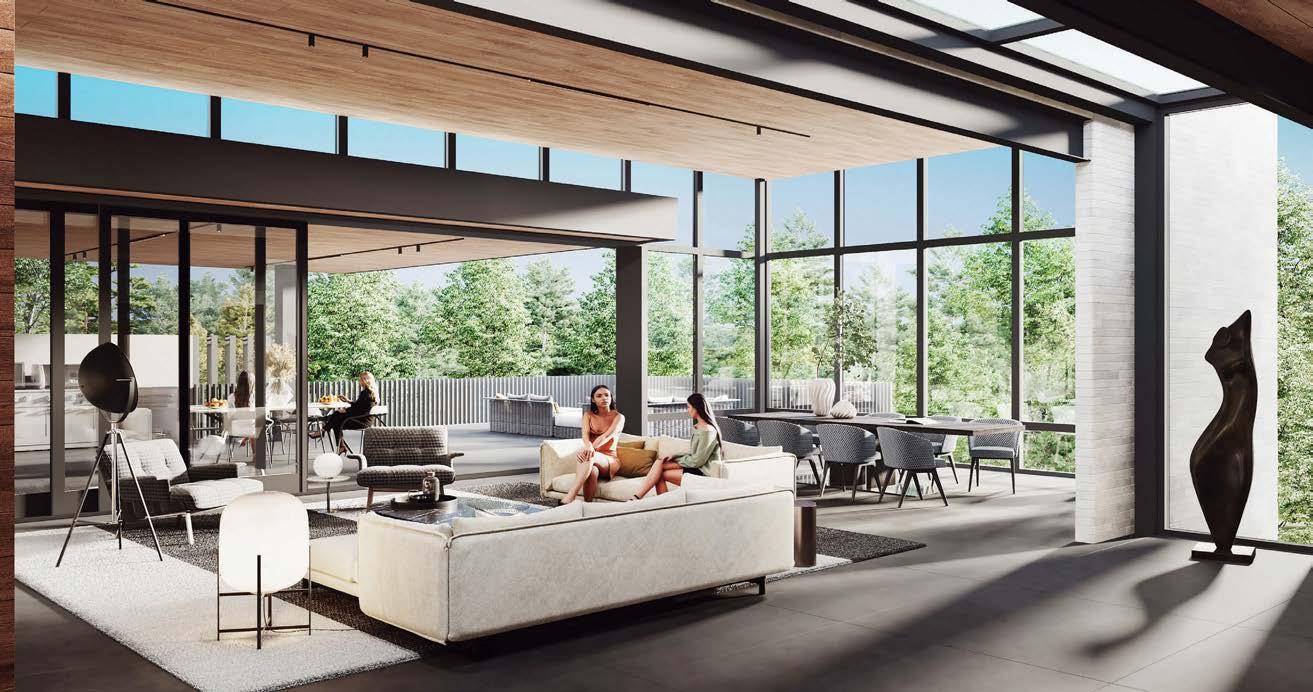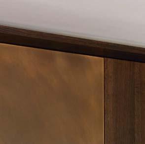 center. Encased within two columns of walnut, bookmatched gray-tone marble slabs rise up to the ceiling, hovering over an airy living area, while a more intimate sitting room awaits on the fireplace’s opposite side. “This was an opportunity for a big wow moment,” Ekle describes. “The effect is warm, inviting and infuses rich materials in a sleek and contemporary way.”