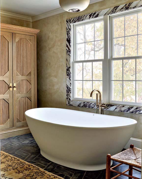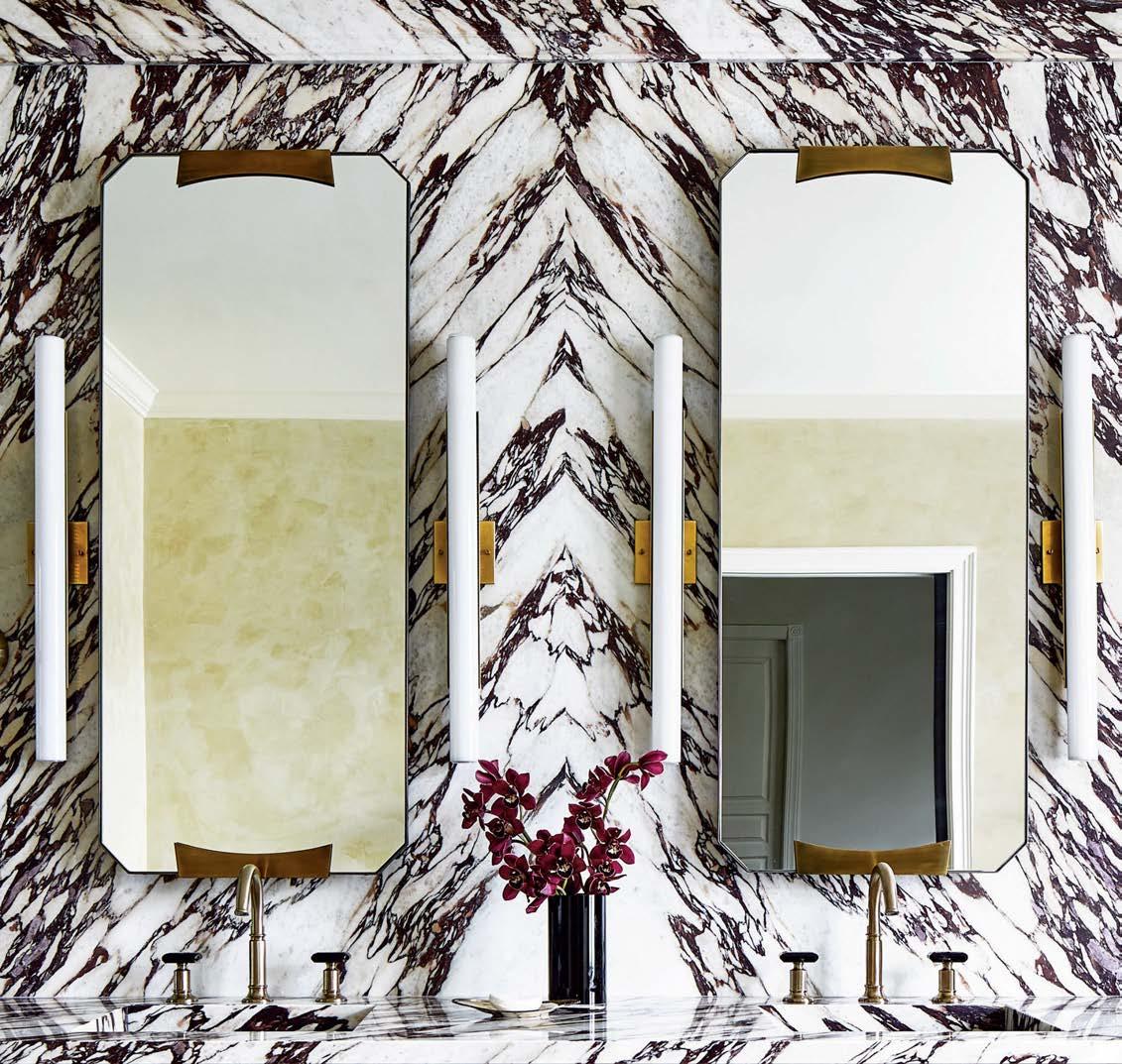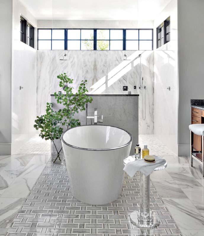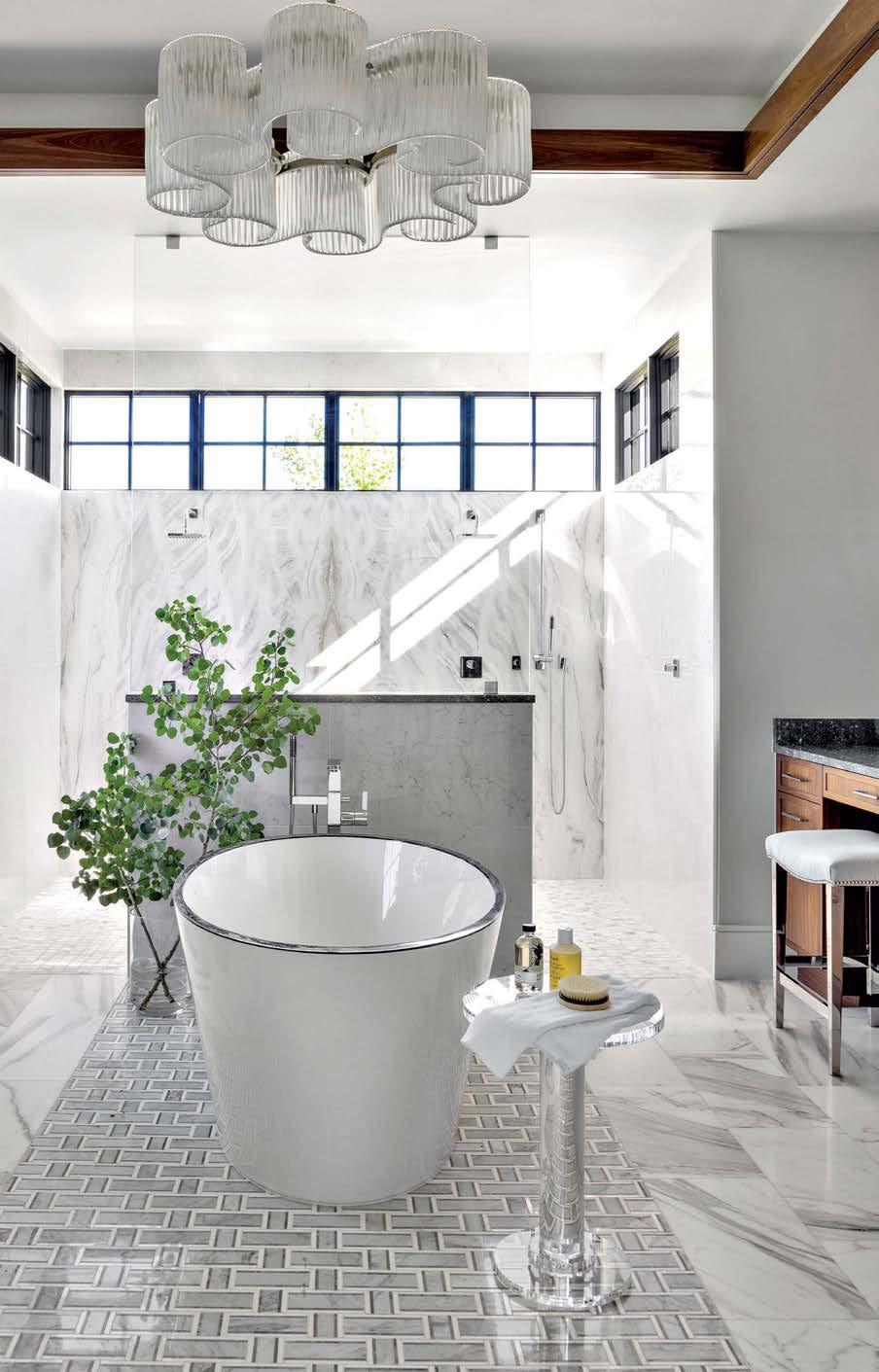 Left: Esplanade French Linen marble floor tiles from TileBar create a woven-mat effect in the owners’ bathroom. Behind the BainUltra tub, a walk-in double shower is clad in Bianco Lasa Covelano marble. The chandelier is from Hudson Valley Lighting Group.