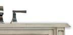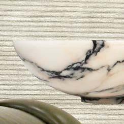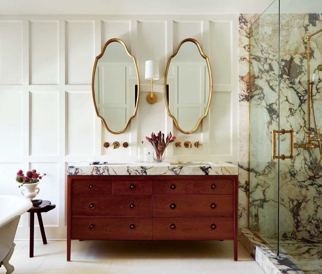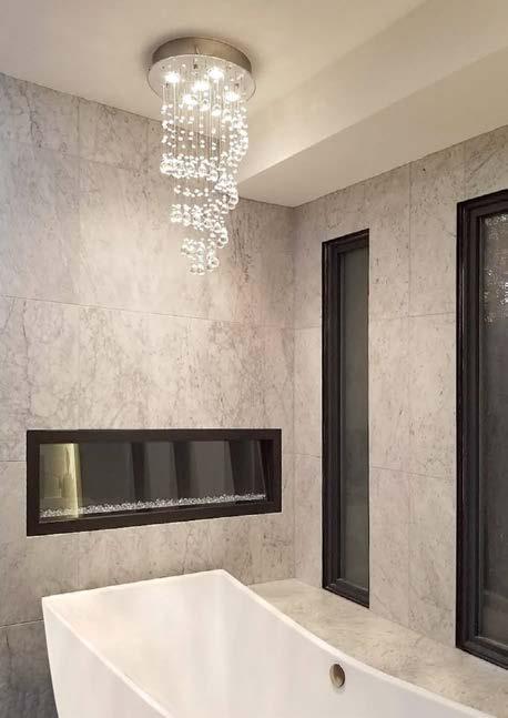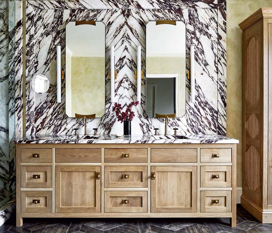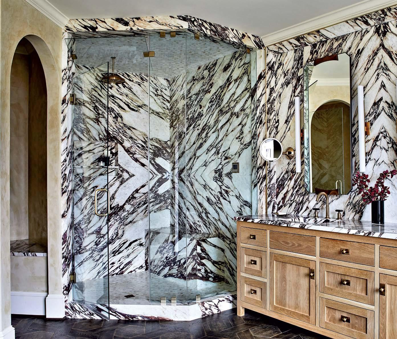 Left: Esplanade French Linen marble floor tiles from TileBar create a woven-mat effect in the owners’ bathroom. Behind the BainUltra tub, a walk-in double shower is clad in Bianco Lasa Covelano marble. The chandelier is from Hudson Valley Lighting Group.