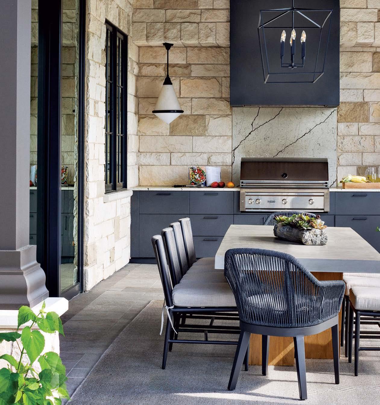 Arteriors pendants flank the bespoke hood and Lynx built-in grill backed by PentalQuartz stone. The Seasonal Living concrete-and-teak table, topped by a Visual Comfort & Co. lantern, is surrounded by Sunset West chairs.