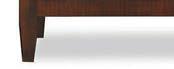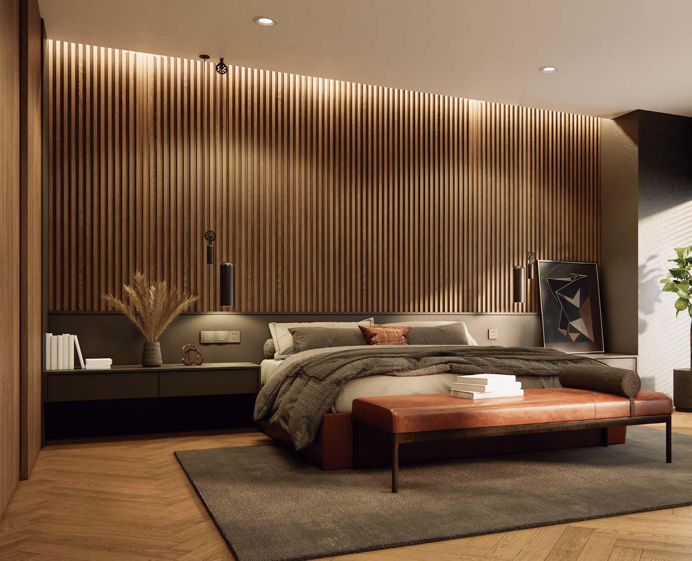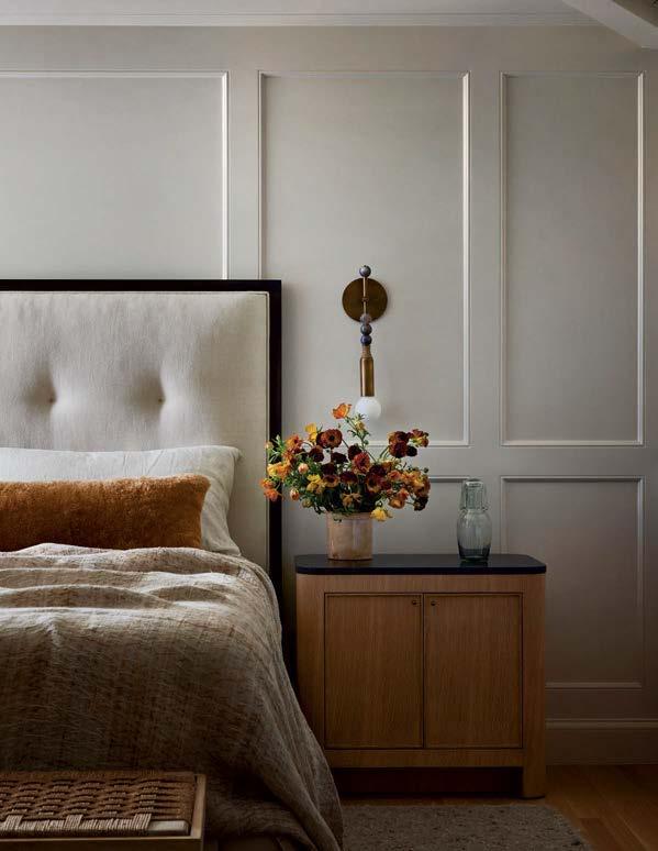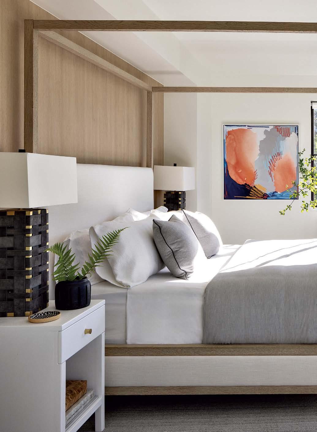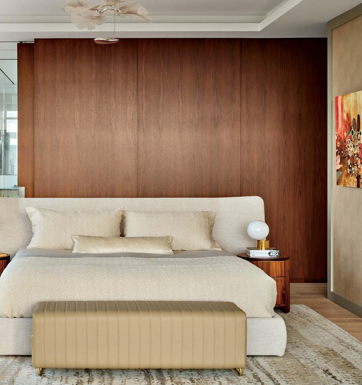 Soft shades infuse the owners’ suite, which features a Poliform bed and Mezzo Collection bench with a rug from The Scarab underfoot. The walnut wall includes a pocket door that can seal off the connected bathroom for privacy. Artwork is by Heather Patterson.