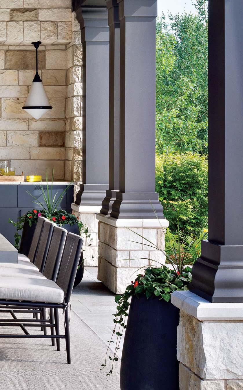 Walls of limestone in a custom color mix used across the façade line the outdoor dining space off the kitchen.