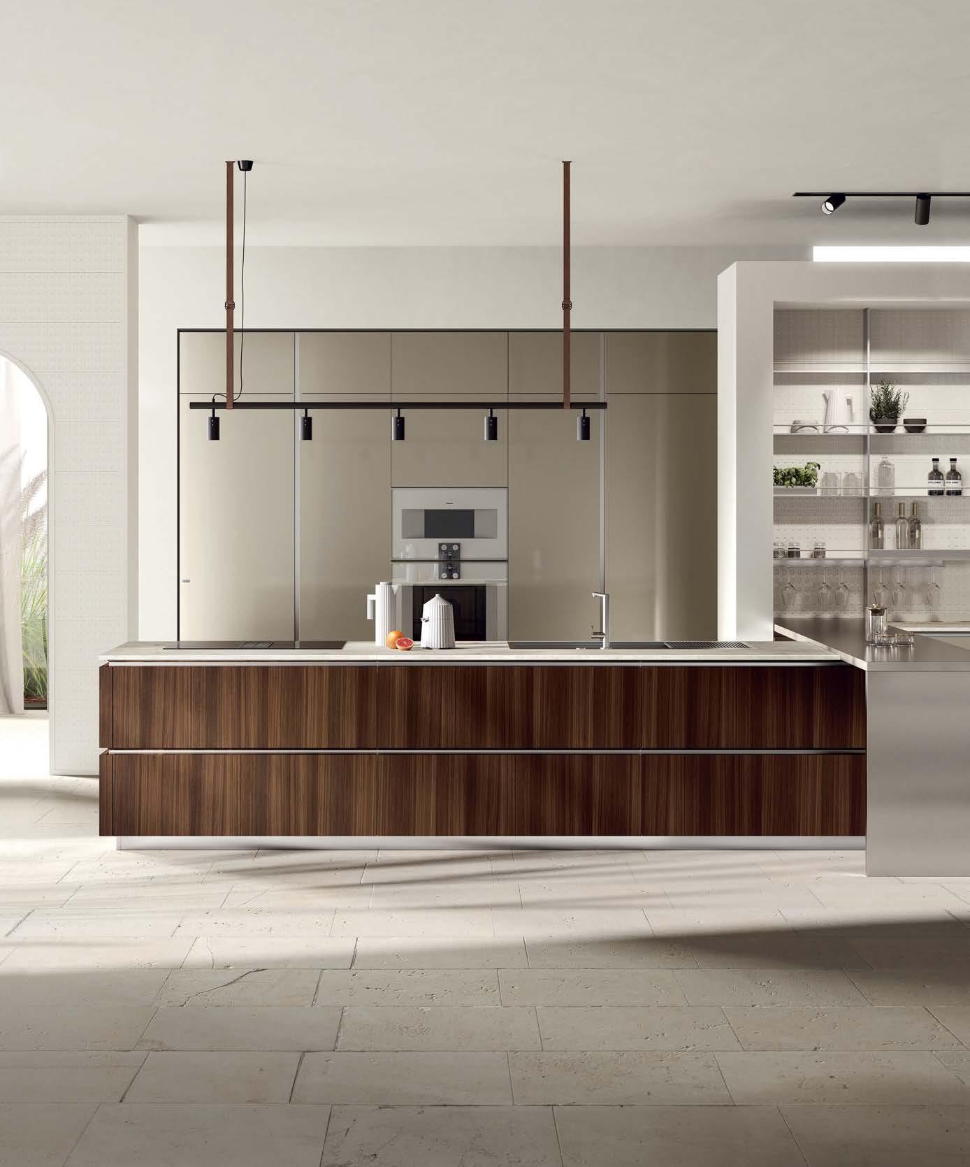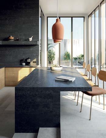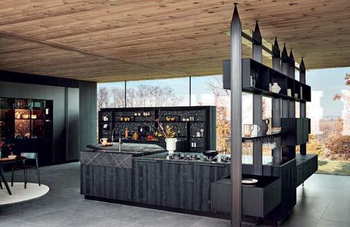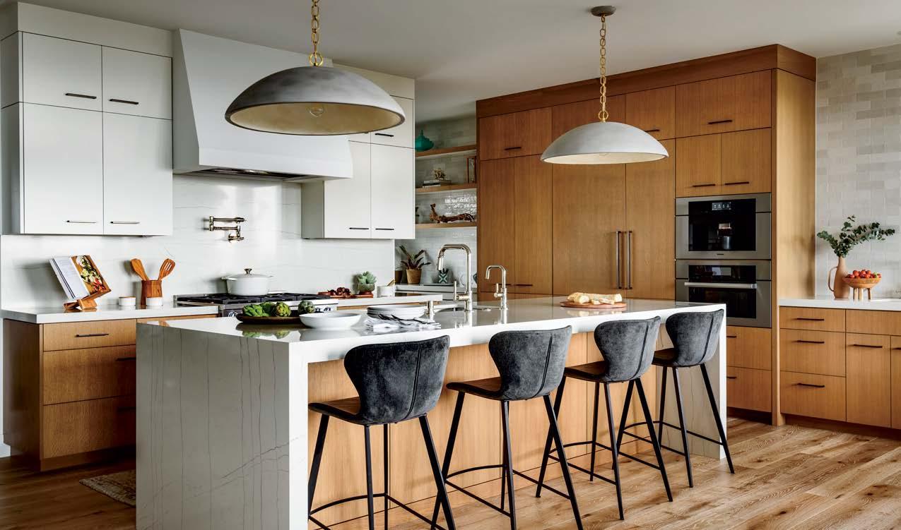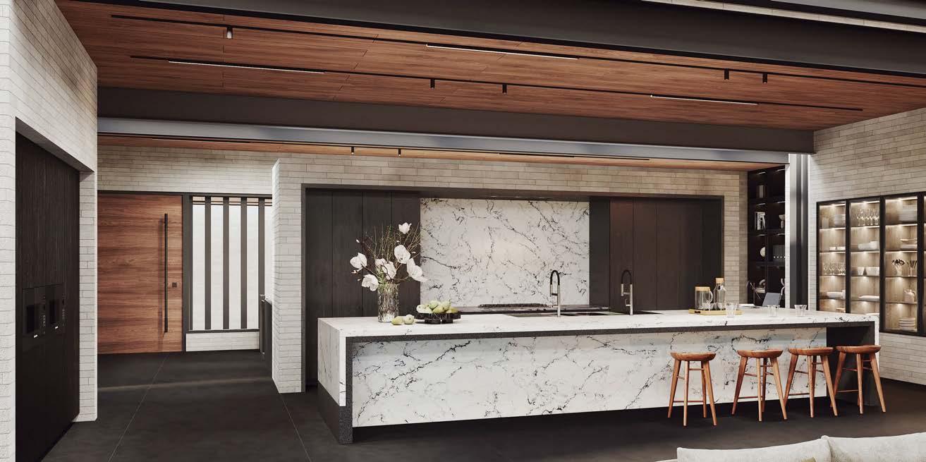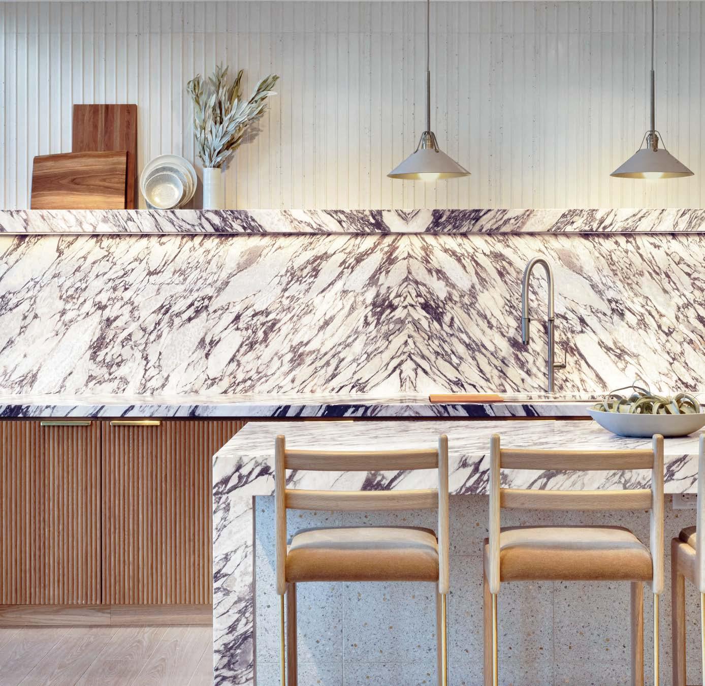 The open kitchen’s eucalyptusveneer cabinetry closes away for a clean paneled look. Island counters are Antolini Calacatta marble, via Galleria of Stone, with matte black cabinets by Aspen Leaf Kitchens.